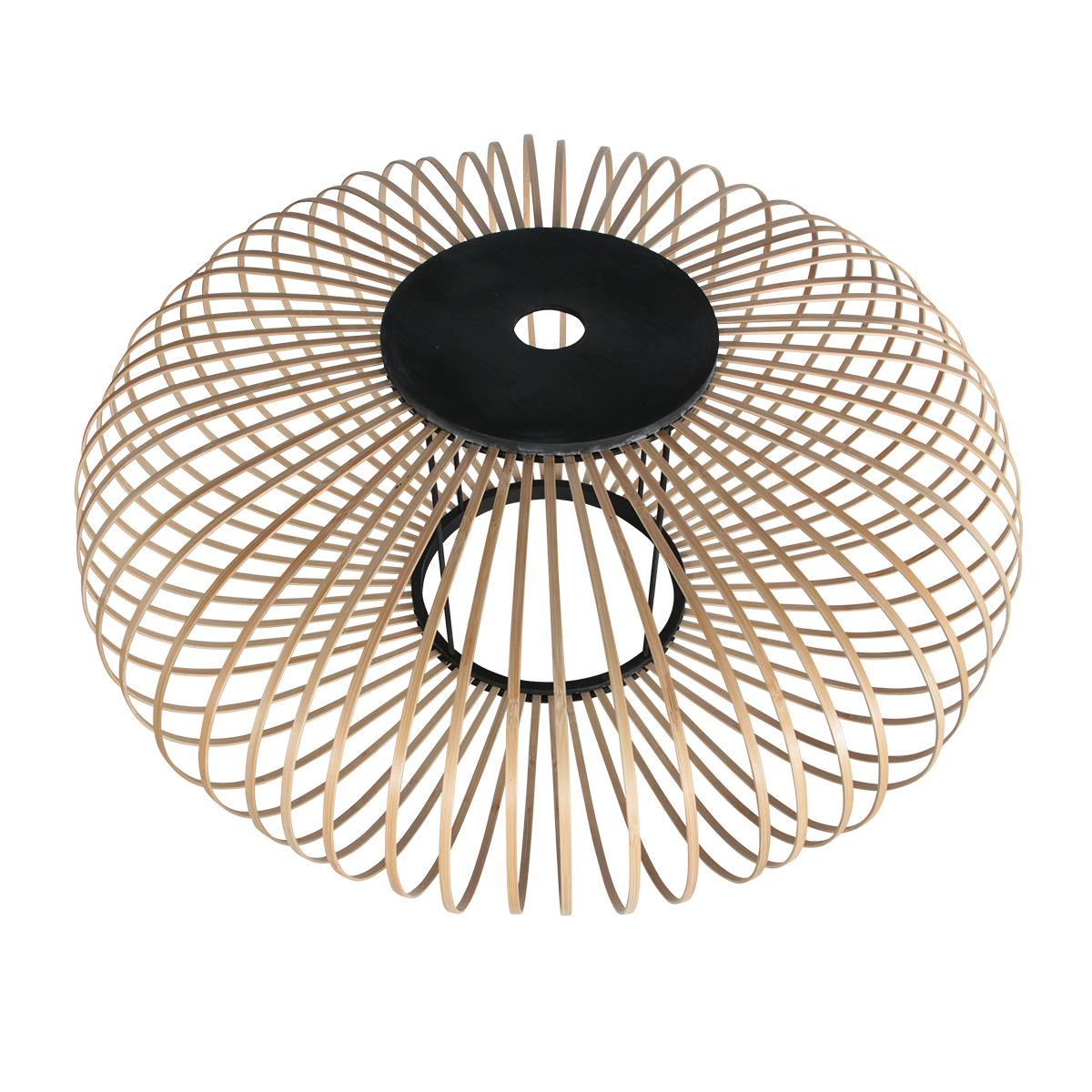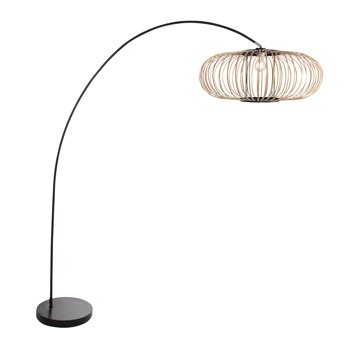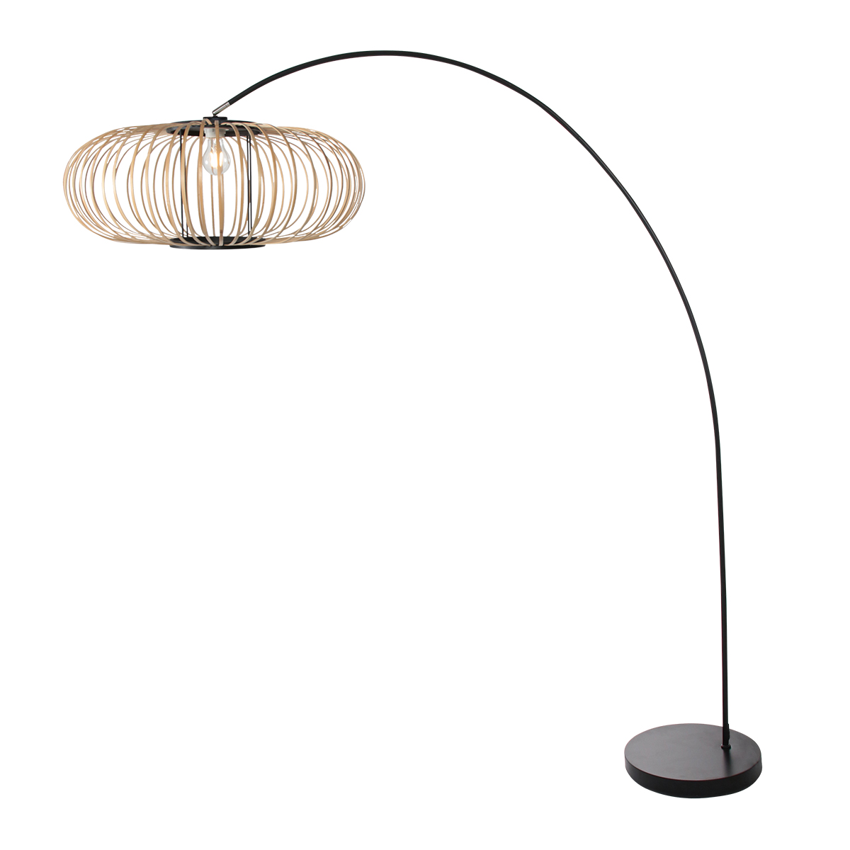 Deze booglamp heeft een slank zwart metalen frame dat vanuit een ronde voet in een ruime, elegante boog naar voren loopt. Aan het uiteinde hangt een open lampenkap van naturel bamboe, opgebouwd uit smalle, gebogen latten. Door deze open structuur blijft de lichtbron zichtbaar en wordt het licht rondom verspreid, wat zorgt voor een warm en luchtig lichteffect. De combinatie van het strakke frame en het natuurlijke bamboe geeft de lamp een rustige maar opvallende uitstraling.