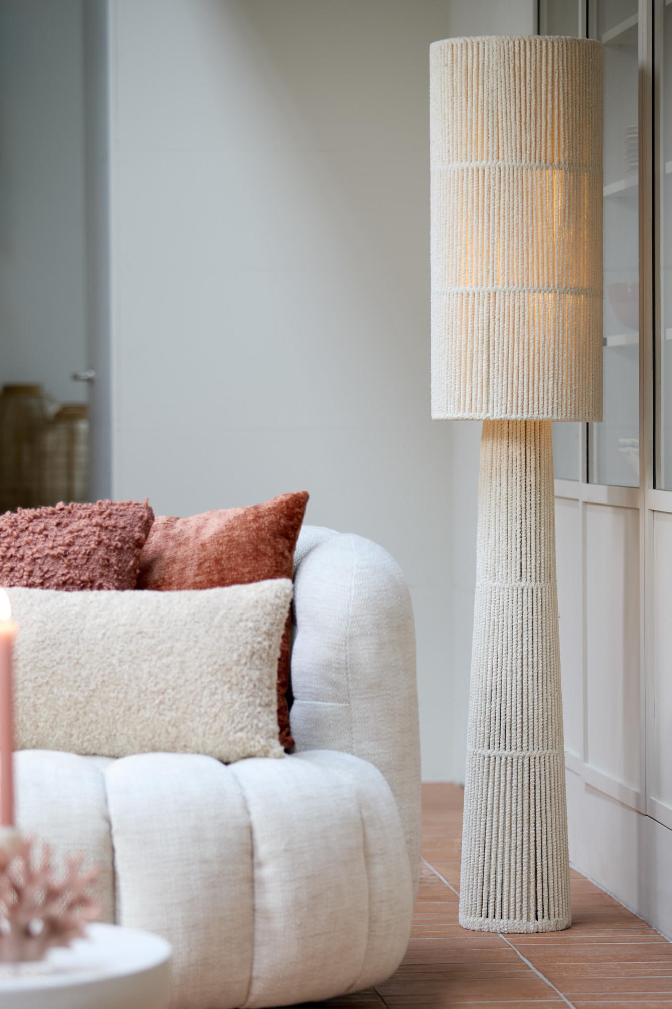 Breng een verfijnde uitstraling en praktische functionaliteit in uw interieur met deze elegante beige vloerlamp van Light & Living, die perfect aansluit bij de rustieke charme van een Japandi-stijl inrichting. Met een hoogte van 160 cm, een lengte van 30 cm en een breedte van 30 cm, is deze cilindervormige staande schemerlamp uit de Michiel-serie ideaal voor het verlichten van uw woonkamer, slaapkamer of eetkamer. De warm afgewerkte textiel materiaal zorgt voor een gezellige sfeer, en de lamp is eenvoudig te bedienen met een snoerschakelaar. Inclusief snoer, maar zonder lichtbron, waardoor u zelf de perfecte energiezuinige verlichting kunt kiezen.