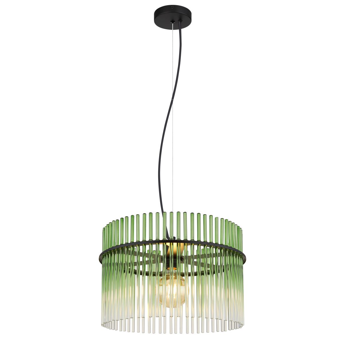 De GORLEY hanglamp is een elegant en tijdloos design dat elke ruimte met stijl verlicht. Het ronde lichaam van matte zwarte metaal steunt op een fraaie ronde kap, gemaakt van kunstzinnig gerangschikte groene glazen staven. Dit unieke ontwerp creëert een fascinerend lichtspel en zorgt voor een uitnodigende sfeer. Dankzij de veelzijdigheid van de GORLEY hanglamp past deze perfect in verschillende interieurstijlen en voegt het stijlvolle accenten toe aan woonkamers, eetruimtes of gangen.