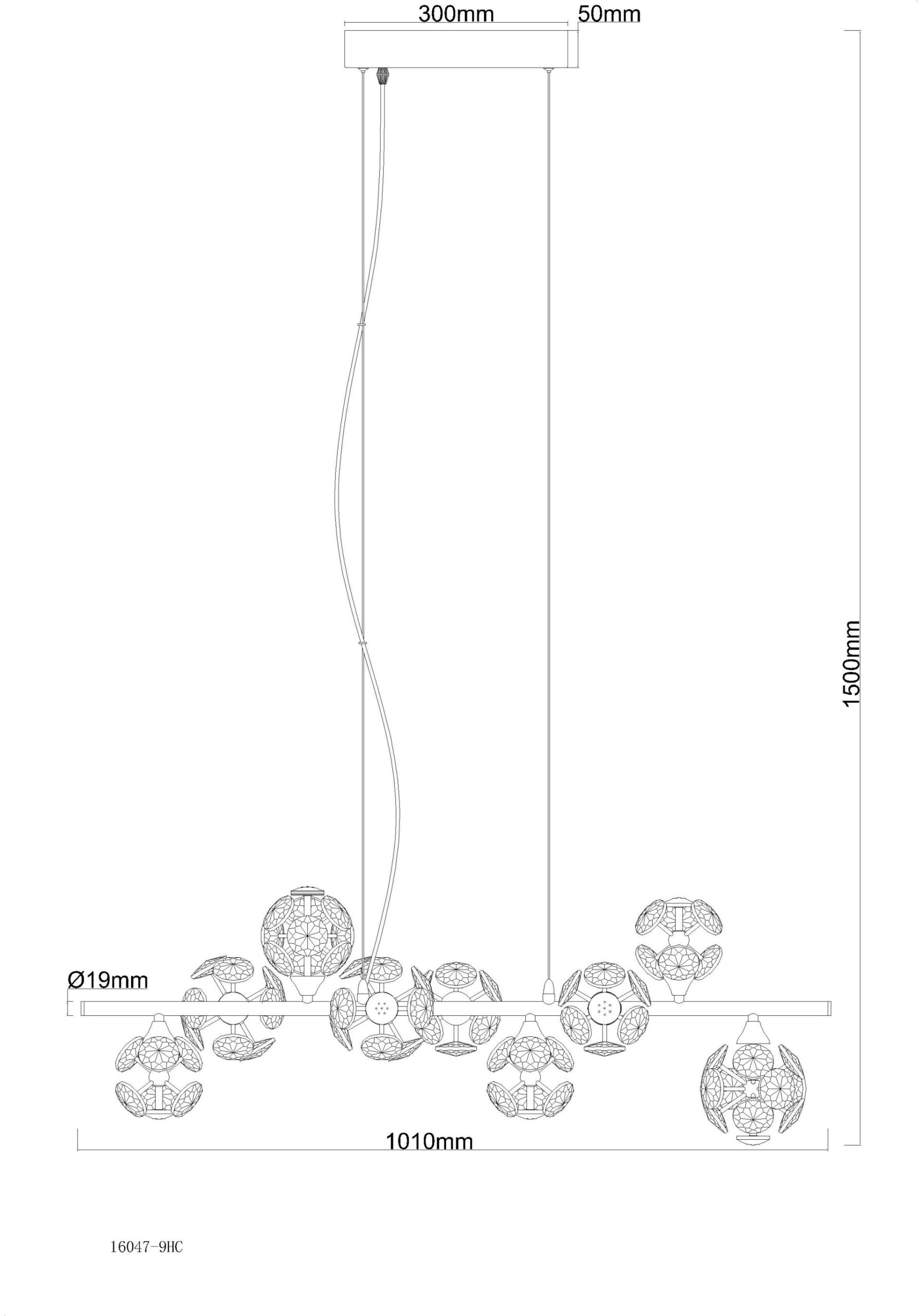 De VIRINA hanglamp is een prachtige aanvulling voor uw interieur, dankzij het elegante ontwerp en de luxe materialen. De rechte balk van chroomgeplateerd metaal ondersteunt diverse bollen van helder K9 kristal. Deze kristallen vangen het licht op een bijzondere manier, waardoor sprankelende en stijlvolle verlichting ontstaat. Met een afmeting van 866 mm in lengte en 360 mm in breedte is deze lamp perfect voor grotere ruimtes zoals woonkamers, eetkamers en gangen.