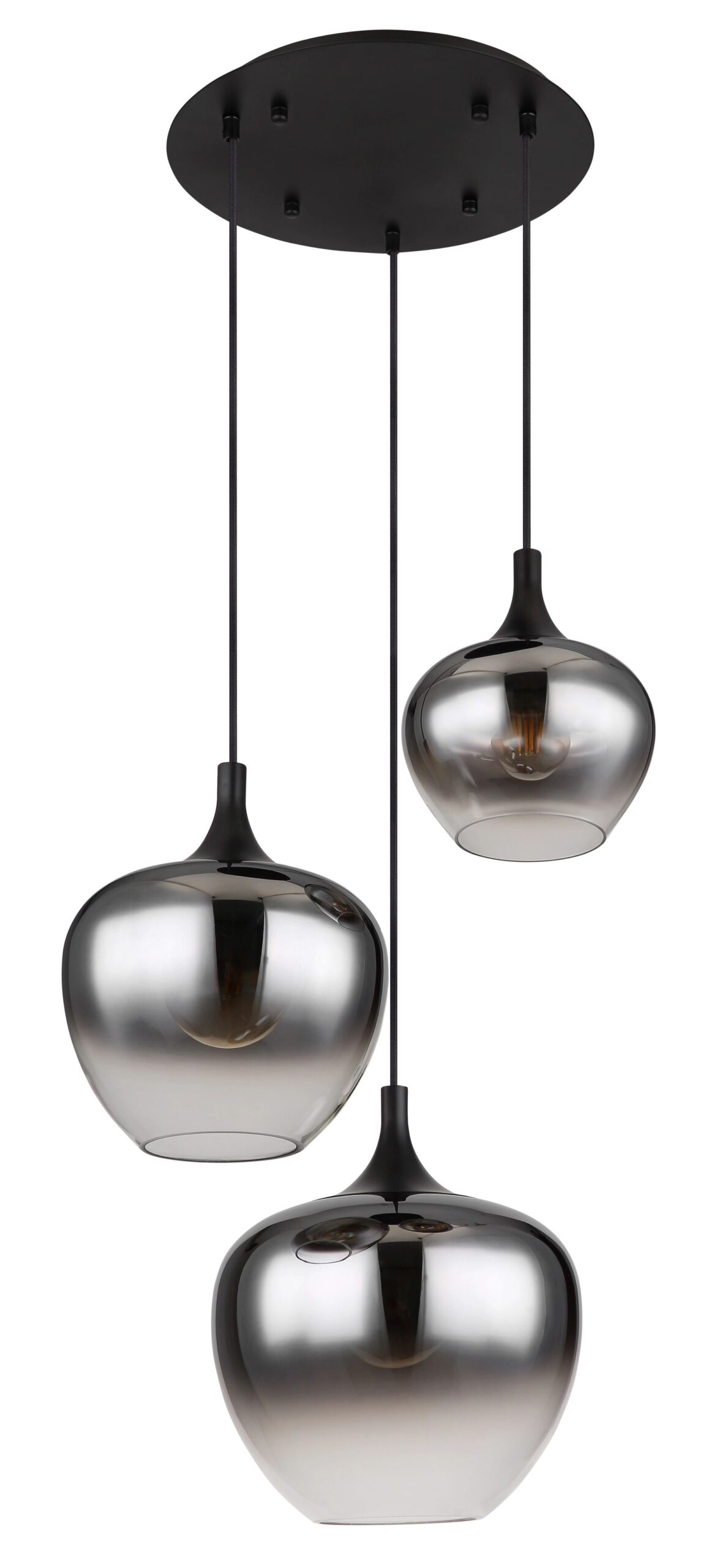 Deze unieke hanglamp is een ware blikvanger voor elke kamer. Met een ronde plafondbevestiging van 30 cm beginnen drie kabels die variëren in lengte tot 1,2 meter. Aan het einde van deze kabels bevinden zich elegante E27-fittingen, elk met een fraaie rookglazen kap die voor een warm en sfeervol licht zorgt. De E27-fitting biedt je de mogelijkheid om jouw voorkeur voor lichtkleur en helderheid te bepalen, met een maximaal vermogen van 40 watt. Voor een milieuvriendelijke en energiezuinige keuze bevelen wij het gebruik van LED-lampen aan.