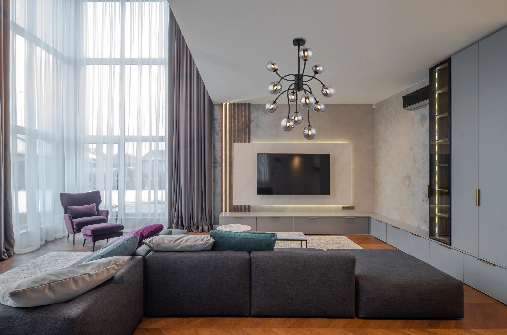 De RIHA plafondlamp kenmerkt zich door een ronde vorm die bijdraagt aan een elegante en minimalistische uitstraling. Wat deze lamp echt bijzonder maakt, zijn de 12 gebogen armen, elk voorzien van een stijlvolle glazen bol. De rokerige kleur van de glasballen geeft de lamp niet alleen een unieke uitstraling, maar ook een sfeervolle ambiance die vele interieurs kan aanvullen. Bovendien is het lichaam van de lamp vervaardigd uit zwart gelakt metaal met een matte afwerking, wat de tijdloze esthetiek verder benadrukt.