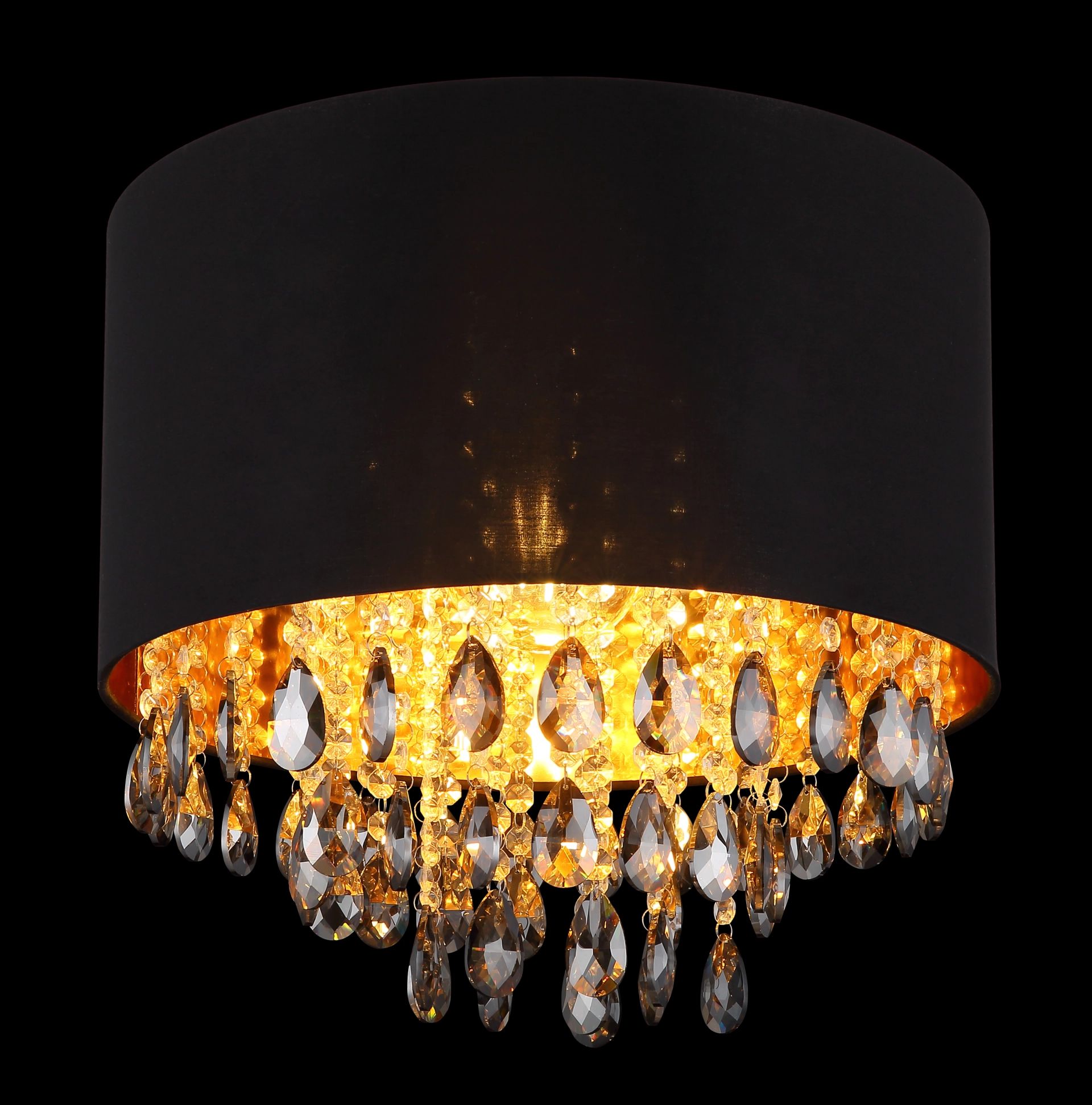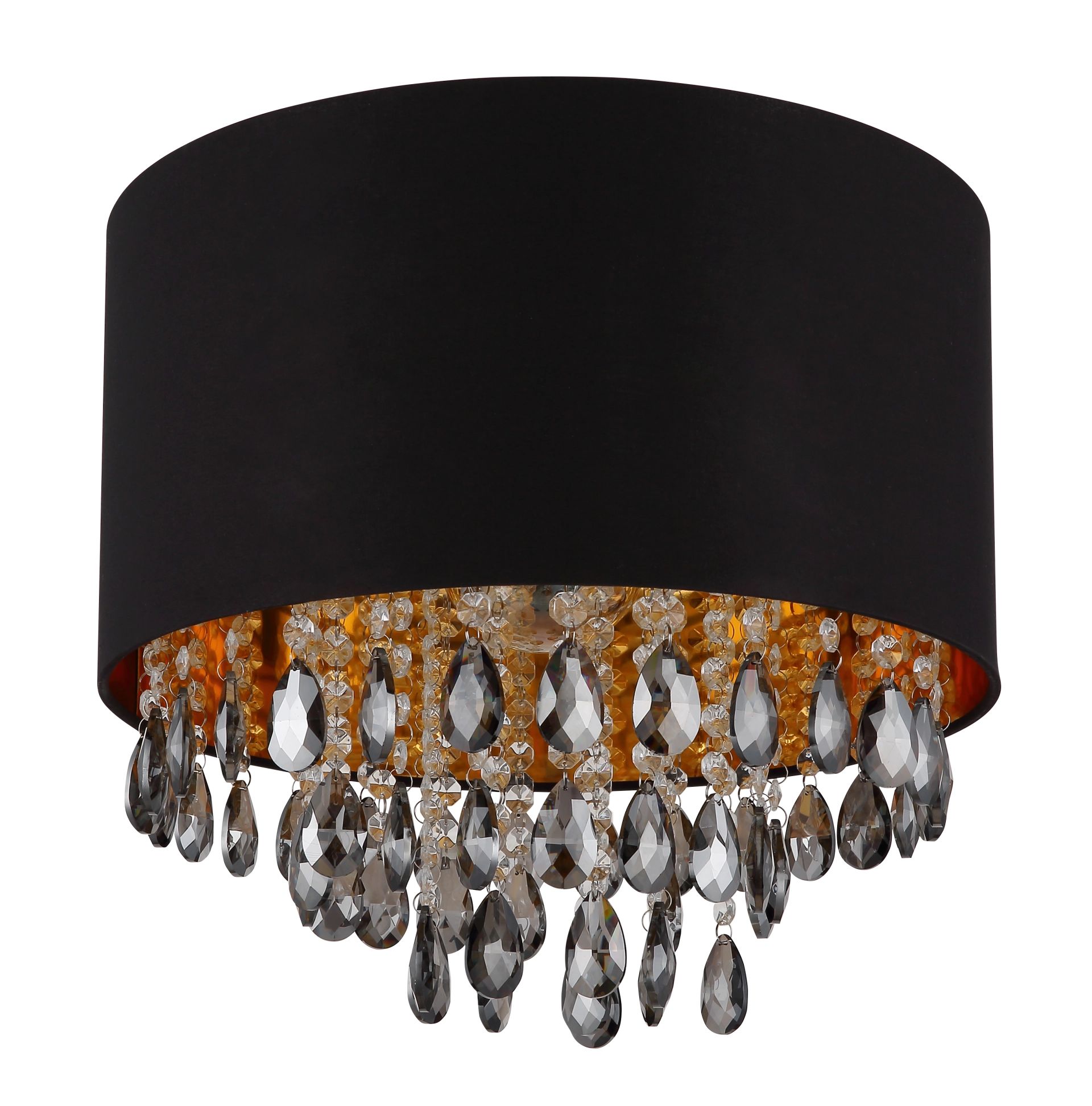 De COLETTA plafondlamp is een echte blikvanger met zijn elegante ronde textielschaduw en schitterende sprankelende kristallen die binnenin hangen. De matte zwarte schaduw in combinatie met de heldere, rokerige kristallen zorgt voor een luxe uitstraling, perfect voor klassieke woonruimtes. Deze lamp biedt de mogelijkheid om een E27 lamp te plaatsen, niet inbegrepen, zodat je zelf de lichtbron kunt kiezen die het beste bij jouw stijl past.