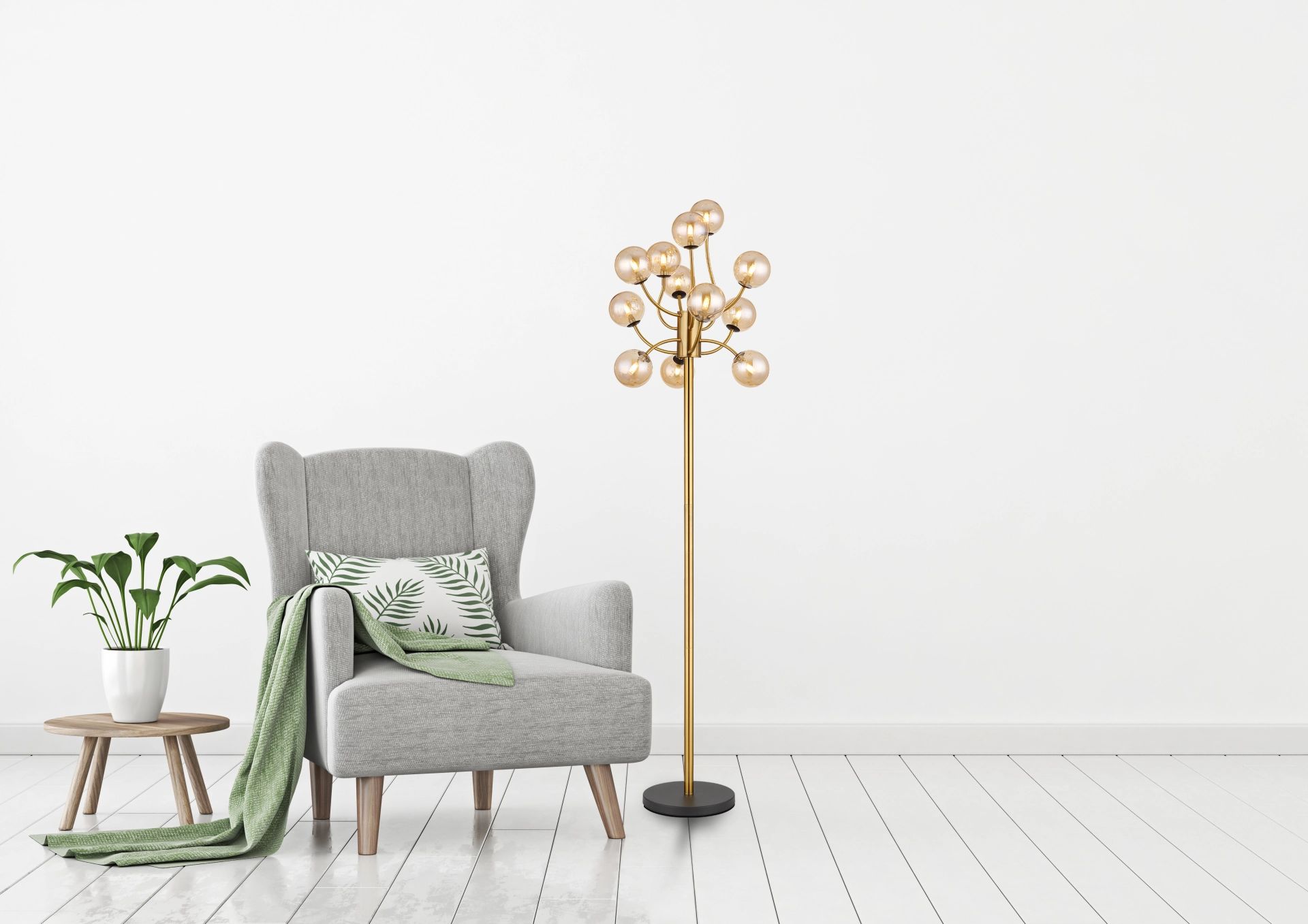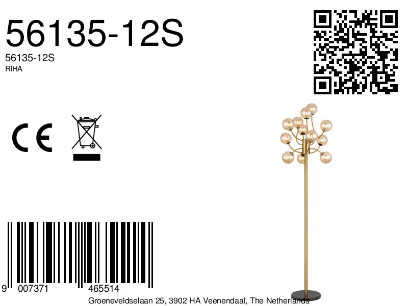 De RIHA vloerlamp combineert elegant design met functionele verlichting. Het ronde ontwerp in goudkleurig mat metaal en messingkleurig mat metaal geeft de lamp een luxe uitstraling. Met twaalf gebogen armen die zijn versierd met amberkleurige glazen bollen, zorgt deze lamp voor een warm en uitnodigend licht. Met een lichtopbrengst van 290 lumen en een aangename LED-technologie van 3000 K creëert de RIHA vloerlamp een gezellige sfeer in elke ruimte.