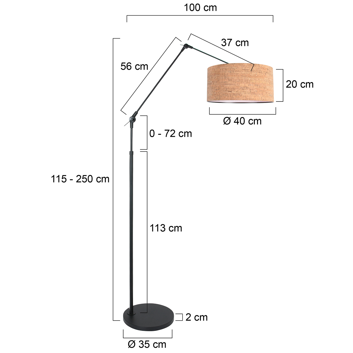 Deze grote zwarte booglamp uit de Prestige Chic serie is uitgevoerd met een royale ronde kurken kap van 40 centimeter breed en 20 centimeter hoog. Het slanke zwarte armatuur is verstelbaar, waardoor je het licht eenvoudig naar de gewenste plek beweegt. De kantelbare E27 fitting zorgt ervoor dat de kap altijd recht hangt en het 220 centimeter lange snoer met voetschakelaar maakt de bediening extra gemakkelijk.