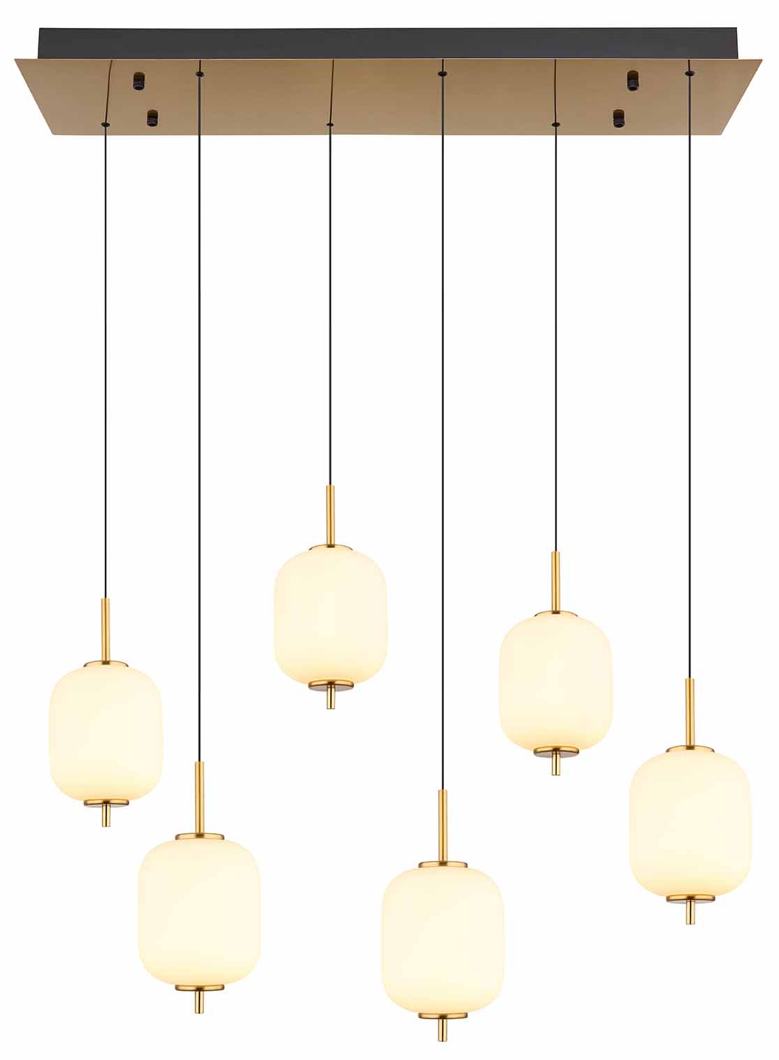 Deze hanglamp is 780 mm lang, 285 mm breed en 1500 mm hoog. Gemaakt van messingkleurig en zwart mat metaal met opaalglas, biedt het verstelbare hoogte en warm licht dankzij de 28W LED-lamp (2800 lm, 3000K).
