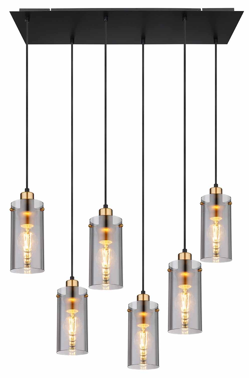 Deze stijlvolle hanglamp uit de Fanni serie biedt een moderne uitstraling met zes E27-fittingen, elk voorzien van een cilindrische, rookkleurige kap met messing afwerkingen, hangend aan zwarte kabels van een rechthoekige plafondbevestiging (75x24cm) op 1,2 meter hoogte. Geschikt voor lampen tot 40 watt, ideaal om uw woonruimte te complementeren.