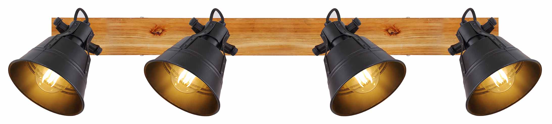 Ontdek de “GÜNTHER”, een viervlammenspot met een industrieel en elegant design. Deze spot is uitgerust met een houten muurbeugel en vier matte zwarte metalen tinten met een schitterende gouden binnenkant (L: 82cm, H: 24cm). Pas zelf de E27-fittingen aan met lampen naar keuze (max. 60 watt) om de ideale lichtkleur en intensiteit te bepalen.