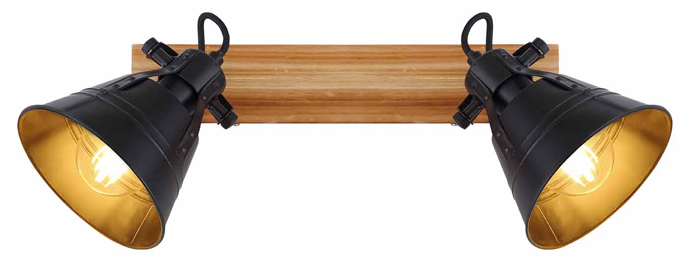 Verenig industriële stijl en elegantie met de tweevlammenspot “GÜNTHER”. Deze lamp beschikt over een houten muurbeugel en twee zwarte matte metalen tinten met een schitterende gouden binnenzijde (L: 38cm, H: 24cm). Pas de E27-fitting naar uw eigen smaak aan met lampen tot maximaal 60 watt om de ideale lichtkleur en intensiteit te creëren.
