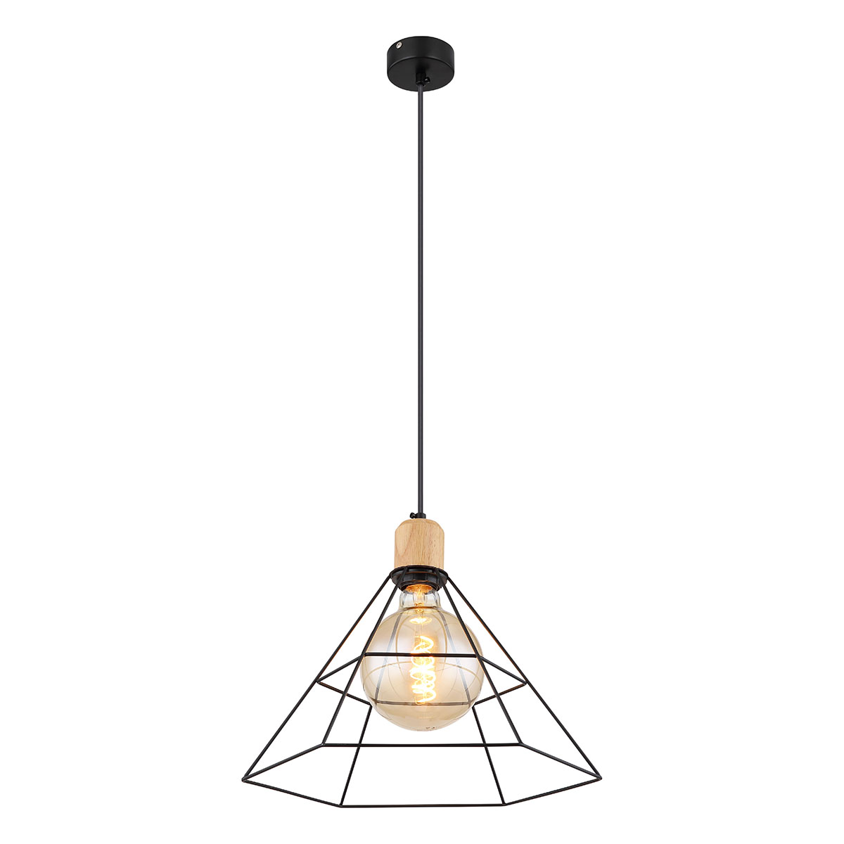Deze moderne hanglamp uit de Helene serie overtuigt met zijn eenvoudige maar vooral moderne design. De materiaalcombinatie van zwart mat metaal en hout overtuigt en wordt een echte blikvanger. Een metalen vlechtkap met een E27-aansluiting hangt aan een 120 cm lange kabel. Met de E27-aansluiting kunt u vrij een lichtbron kiezen tot een maximaal vermogen van 60 watt en zo de helderheid en lichtkleur bepalen.