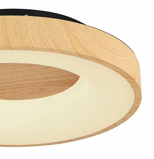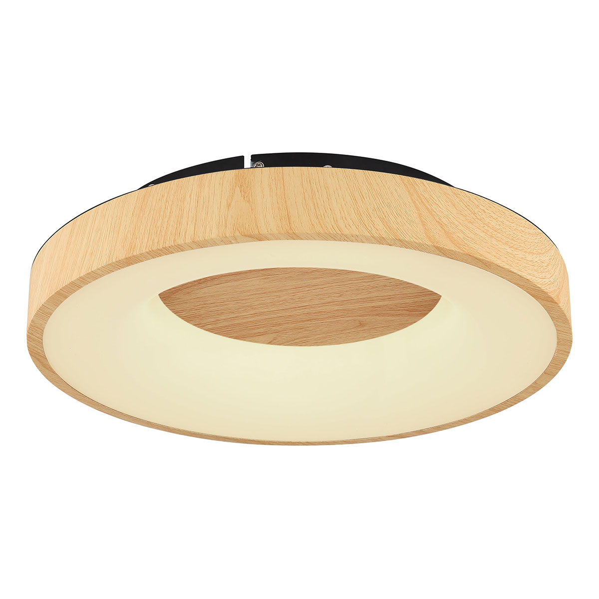 Verras jezelf met een elegante dimbare plafondlamp uit de Jolli-collectie, die zich onderscheidt door zijn fraaie combinatie van een zwarte metalen plaat en een houtlook metalen ring. De opaal plastic omhulling die de ingebouwde LED-lampen met sterkte van 1800 lumen verbergt, zorgt voor een optimale lichtspreiding. Met behulp van een meegeleverde afstandsbediening kunt u de lichtsterkte regelen en de lichttemperatuur gemakkelijk variëren tussen een gezellig warm wit (2700 Kelvin) en een kristalheldere koel wit (6000 Kelvin). Naast een toegevoegde nachtlichtfunctie is deze lamp perfect te combineren met andere modellen uit dezelfde serie voor een stijlvolle en harmonieuze interieurafwerking.