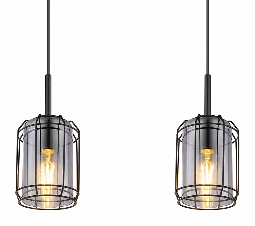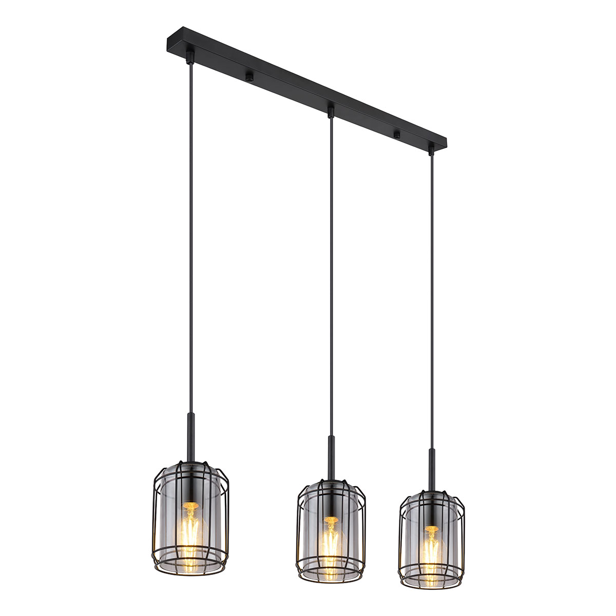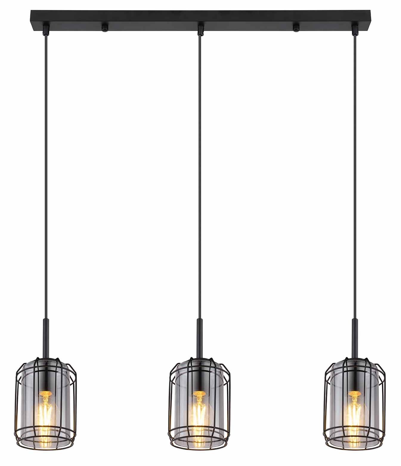 Deze hanglamp uit de Kammi-serie is een stijlvolle aanvulling op uw woon- of eetkamer. De 77 cm lange hanglamp bestaat uit drie rokerige glazen kappen, die zijn omhuld met een zwart mat metalen rooster en tot 120 cm van het plafond aan kabels hangen. Bovendien kunnen ze worden uitgerust met E27-lampen naar keuze, waardoor u de mogelijkheid hebt om de lichtkleur en helderheid individueel te bepalen. Met andere modellen van dezelfde serie kunt u het totaalplaatje in uw vier muren compleet maken.