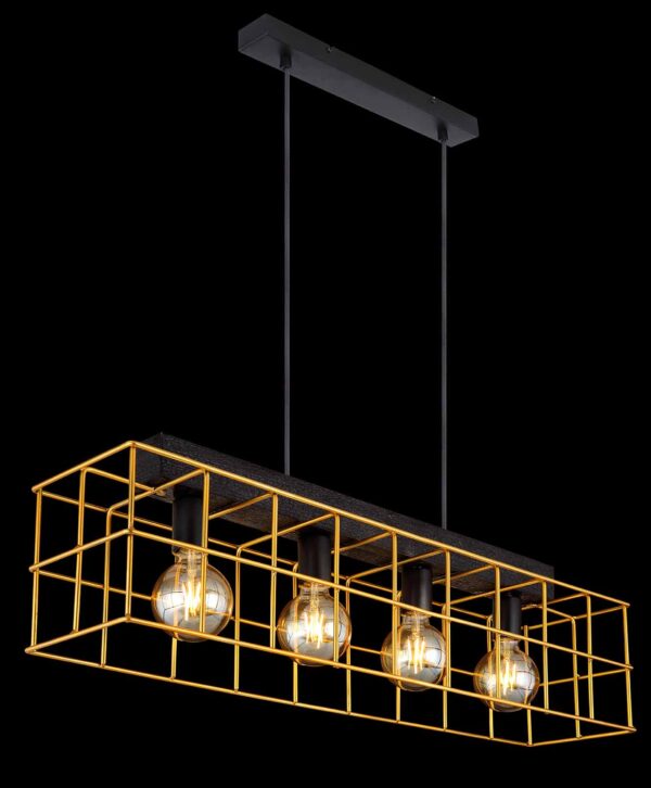 Deze hanglamp uit de Merril-serie overtuigt met zijn stijlvolle design van hout en zwart metaal. De 90 cm lange hanglamp bestaat uit een langwerpige houten balk, voorzien van een zwart metalen rooster, en hangt aan het plafond met twee zwarte kabels. De hoogte is verstelbaar tot 150 cm. Met vier E27-fittingen kunt u de lichtkleur en helderheid aanpassen.