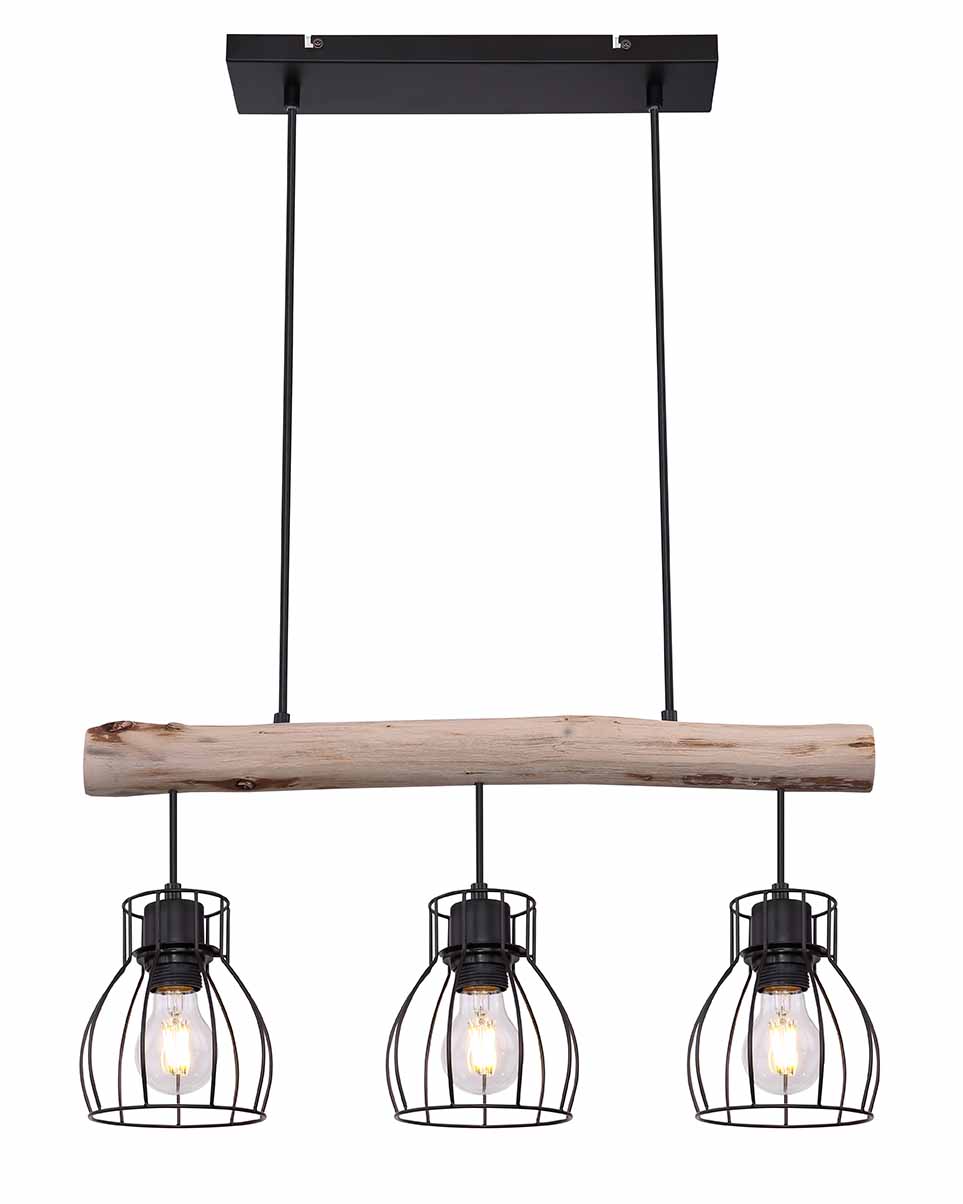 Deze extravagante hanglamp MINA van zwart metaal past in bijna elke kamer. Op een hangende houten balk bevinden zich drie E27-aansluitingen, omgeven door een rastervormige, ronde lampenkap. Door de vrije keuze van de lichtbron (3 x E27/max. 40W) kunt u de lichtintensiteit en -kleur zelf bepalen. Vanwege hun lange levensduur raden we LED-lampen aan. Combineer met andere modellen uit deze serie voor een compleet beeld.