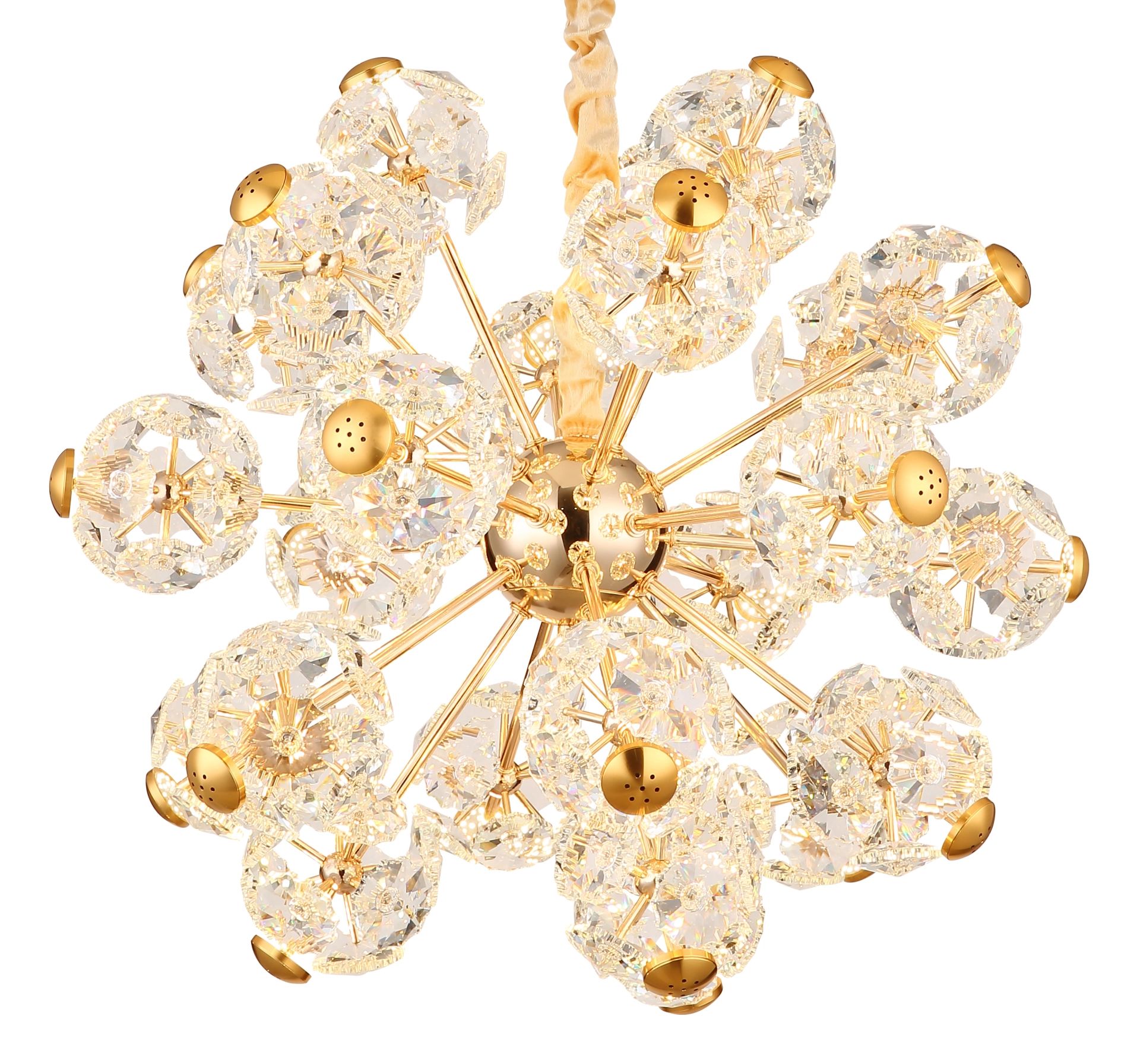 De Floriella hanglamp is een indrukwekkend statement dat iedere ruimte een upgrades geeft. Met een diameter van 650 mm en een elegante ronde vorm trekt deze lamp onmiddellijk de aandacht in uw interieur. Het robuuste goudkleurige metalen frame straalt luxe uit en vormt een prachtig contrast met de glanzende glazen kristallen bollen, die prachtige lichtaccenten genereren.