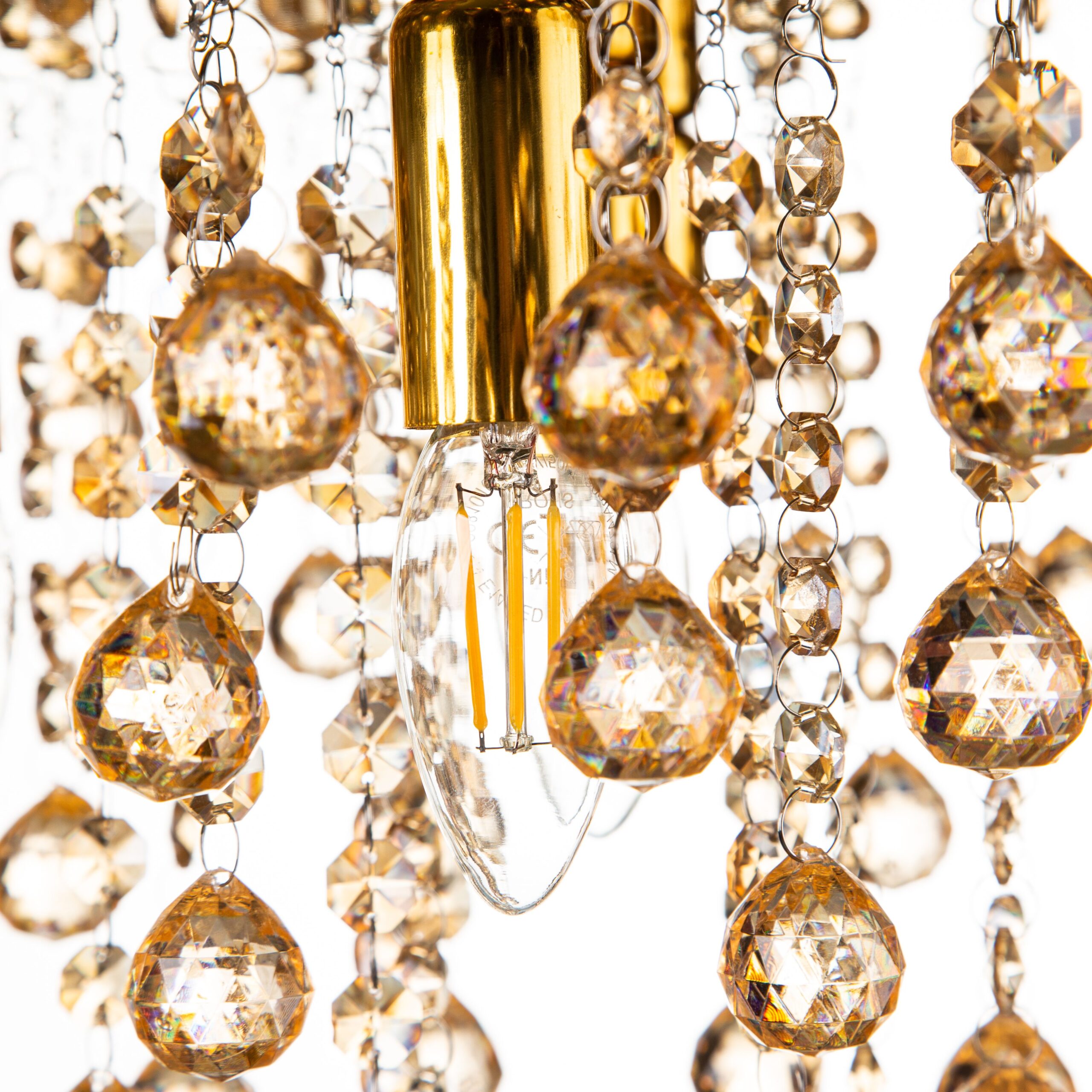 De LONDON plafondlamp in goudkleurig metaal is een schitterend voorbeeld van luxe en elegantie. Met een indrukwekkende diameter van 460 mm en een hoogte van 270 mm is deze lamp een echte eyecatcher in elk interieur. De lamp vereist vijf E14-lampen, niet meegeleverd, met een maximaal vermogen van 40W per lamp. De goudkleurige acrylkristallen zorgen ervoor dat het licht warm en sfeervol door de ruimte verspreidt, wat bijdraagt aan een uitnodigende sfeer.