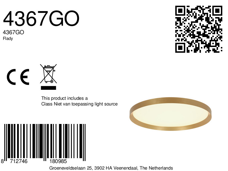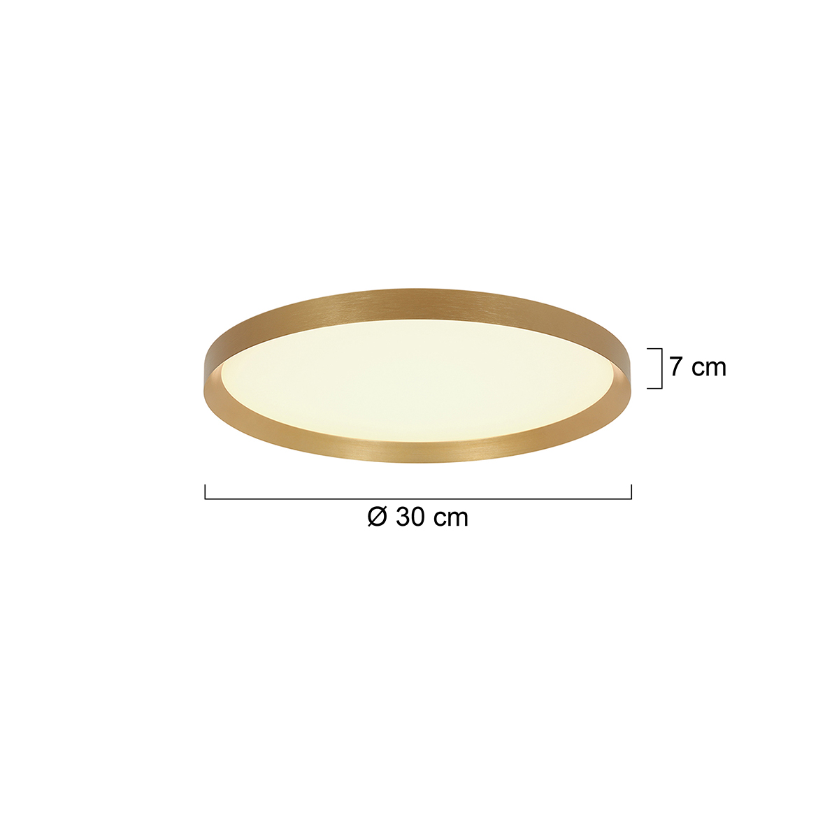 De Flady 4367GO is een moderne plafondlamp met een luxe goudkleurige rand en een compacte vormgeving. Met een diameter van 30 cm en een hoogte van slechts 7 cm oogt de lamp subtiel, terwijl het geïntegreerde 20 watt LED-paneel zorgt voor een krachtige lichtopbrengst van circa 2000 lumen. Dankzij de bijzondere lichtuitstraling naar beneden en subtiel naar boven ontstaat een ruimtelijk en sfeervol effect, ideaal voor woonkamer, slaapkamer, hal of keuken.