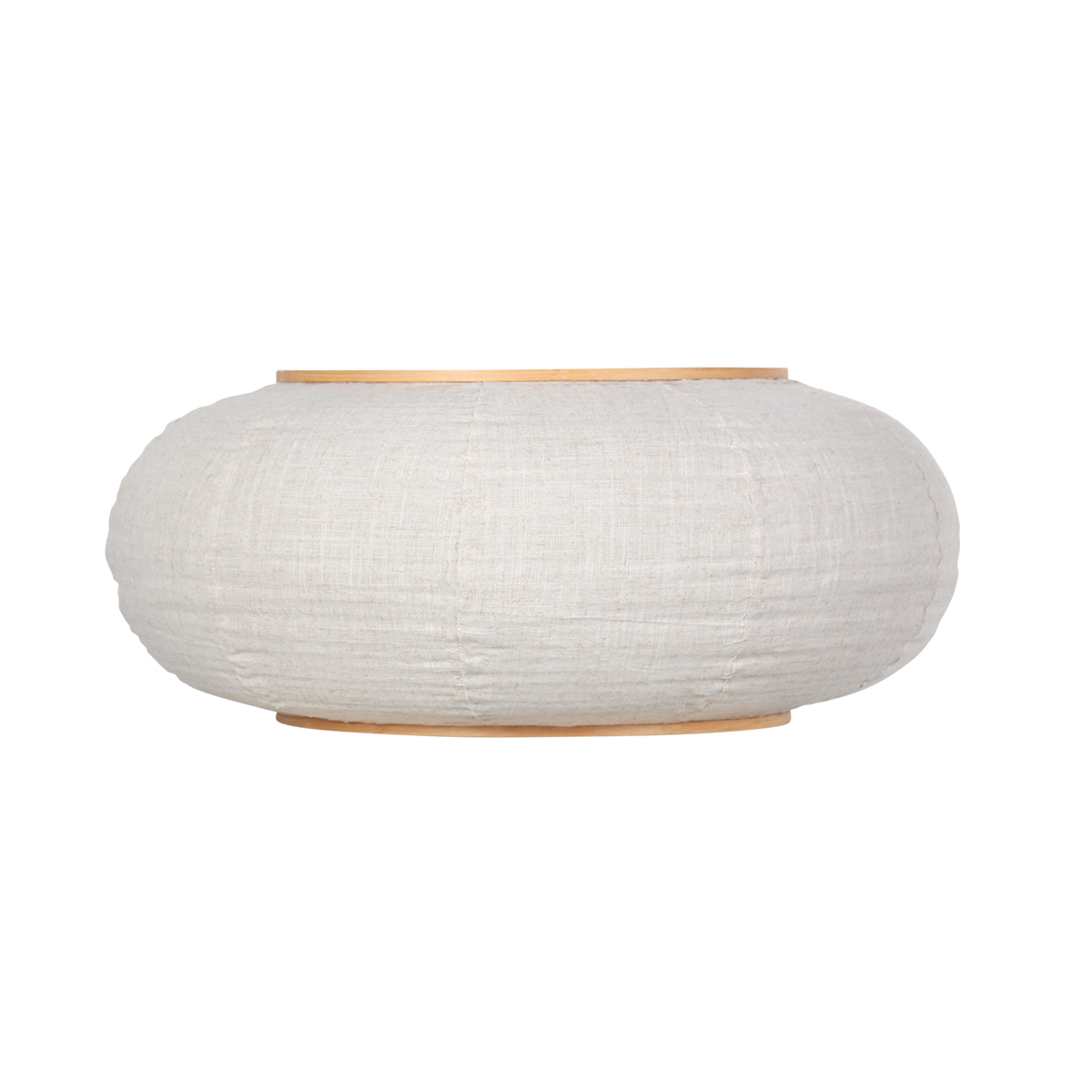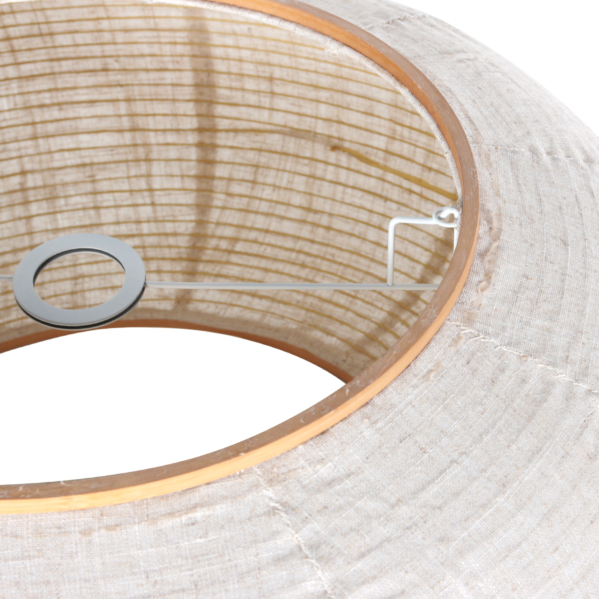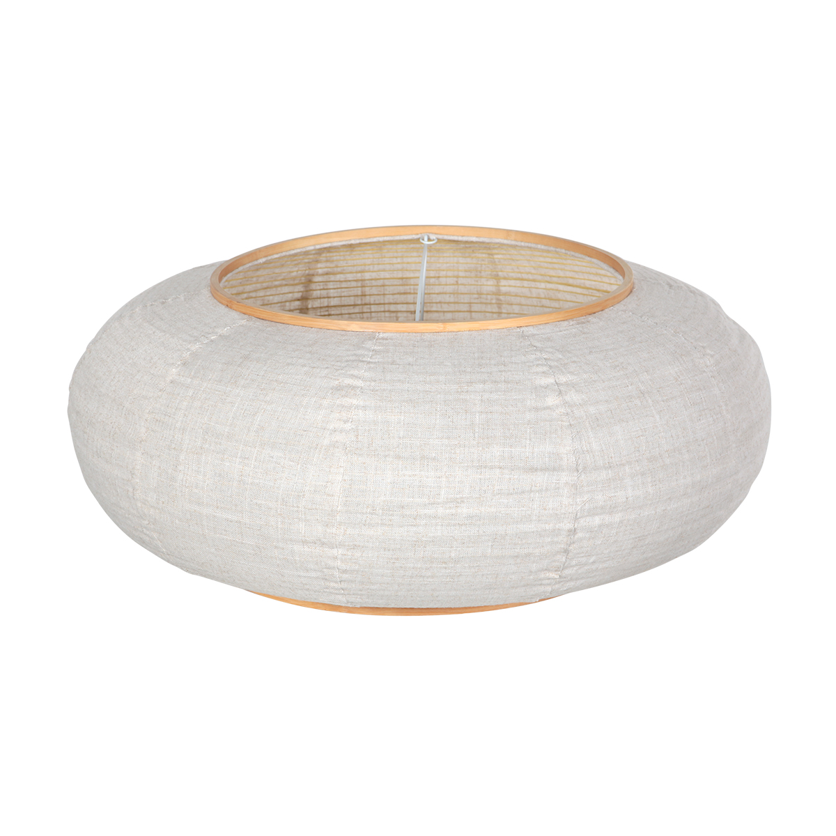 Lampenkap K2026QS heeft een royale diameter van 60 cm en een warme uitstraling dankzij het wit beige linnen en de houten ringen. Het natuurlijke materiaal zorgt voor een zachte lichtverspreiding.