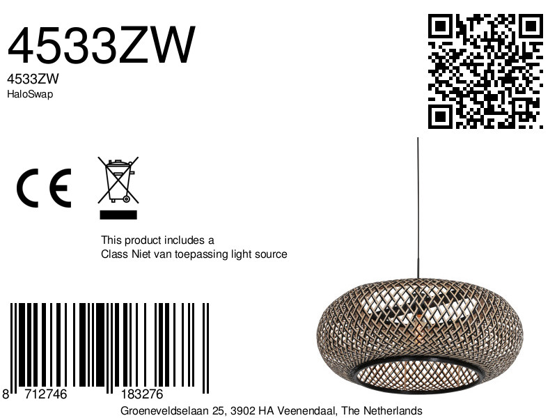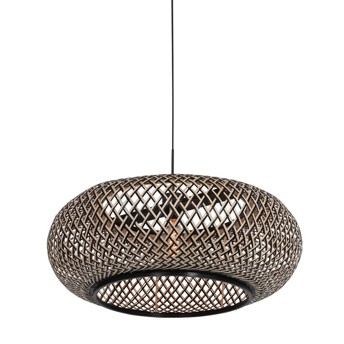 De HaloSwap 4533ZW combineert een zwarte pendel met een handgevlochten bamboekap in een warm tweekleurig ontwerp. De kap van 60 cm diameter creëert een sfeervol lichtspel dankzij de open structuur, terwijl de natuurlijke kleurvariaties zorgen voor een organische uitstraling. Dit maakt de lamp geschikt voor uiteenlopende interieurs, van modern tot oosters en natuurlijk. Het geheel vormt een stijlvolle blikvanger die elke ruimte warmte en elegantie geeft.