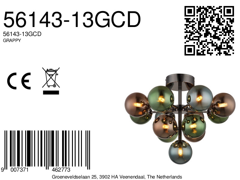 De GRAPPY plafondlamp is een opvallende toevoeging aan elk interieur, dankzij zijn unieke ronde ontwerp en de speelse combinatie van kleurrijke glazen bollen. Het metalen frame, dat een chroomachtige zwarte afwerking heeft, geeft de lamp een moderne uitstraling. De kap bestaat uit diverse glazen sferen in rijke bronzen, groene en petrol tinten, waardoor deze lamp geschikt is voor verschillende kamergroottes. Met een diameter van 560 mm zorgt de GRAPPY plafondlamp voor een indrukwekkend lichtspel; elke glazen bol weerkaatst het licht op een eigen manier en creëert zo een betoverend kleurenspel dat voor een aangename sfeer zorgt.