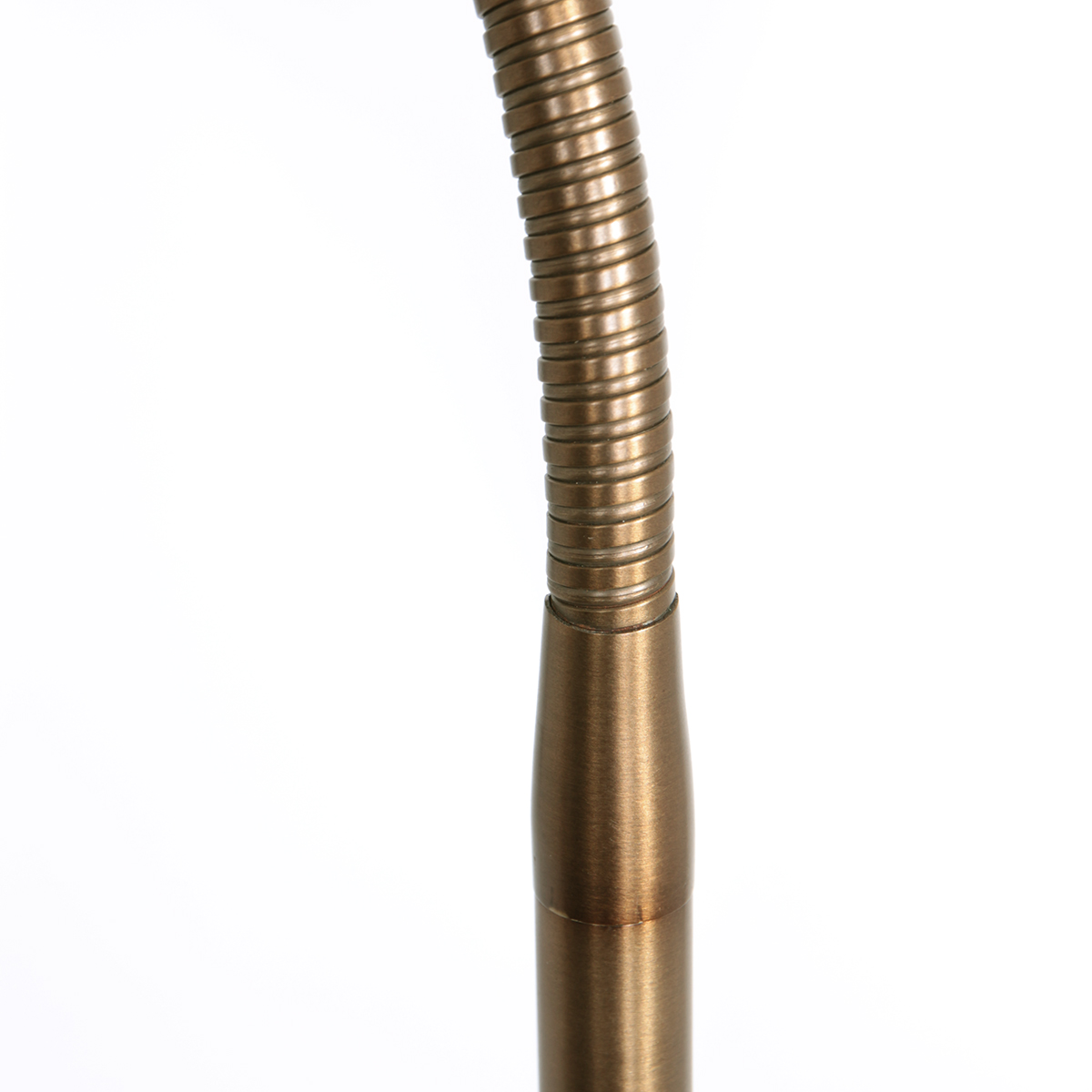 In een klassieke inrichting komt de verstelbare, bronzen vloerlamp van Mexlite helemaal tot zijn recht. Dankzij de flexibele arm kan de lichtbundel op ieder gewenst punt in de kamer gericht worden. Deze lamp is tevens geschikt om naast de bank te zetten en als leeslamp te gebruiken.