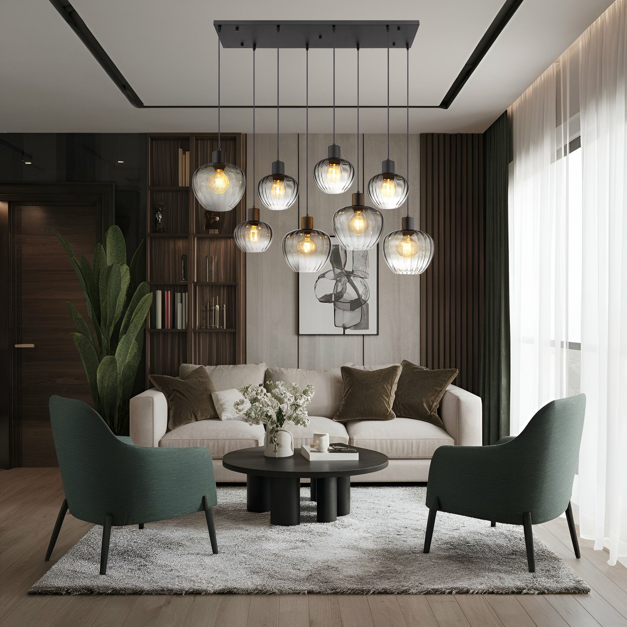 De TOY pendant lamp is een uitstekend vormgegeven hanglamp die een perfecte combinatie biedt van stijl en functionaliteit. Met zijn rechthoekige design en acht bolvormige lenzen, die versierd zijn met verfijnde groeven, vormt deze lamp een opvallend element in elke ruimte. Het gebruik van rookglas zorgt voor een warme en uitnodigende sfeer, waardoor het een unieke toevoeging is aan je interieur. Het mat zwarte metalen frame geeft de lamp een robuuste uitstraling, zonder afbreuk te doen aan de elegante esthetiek.