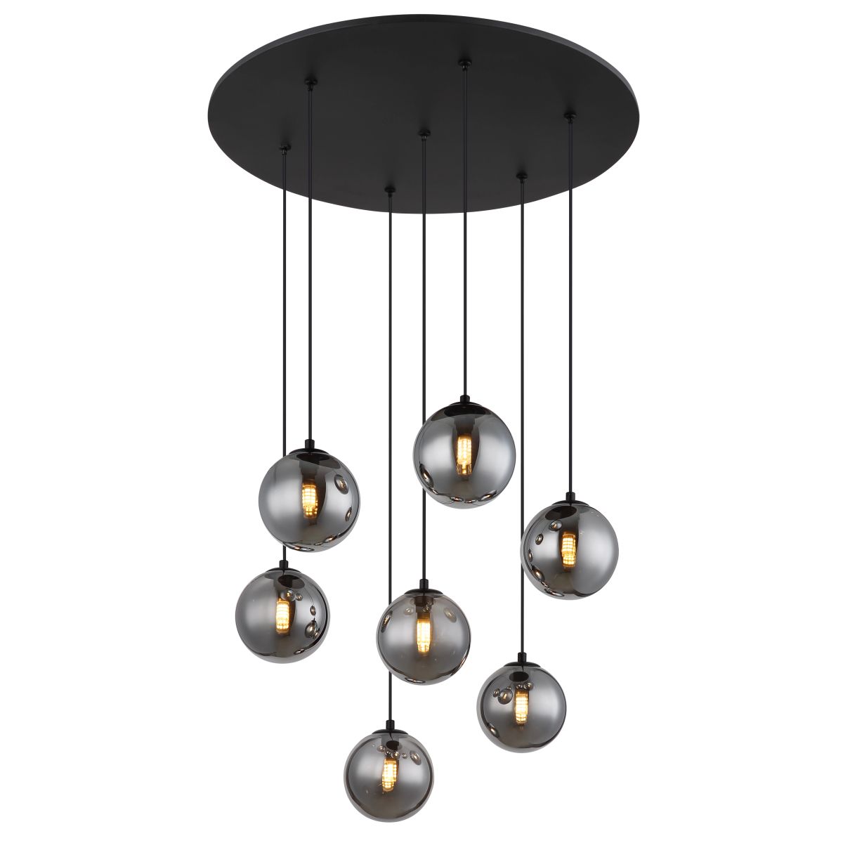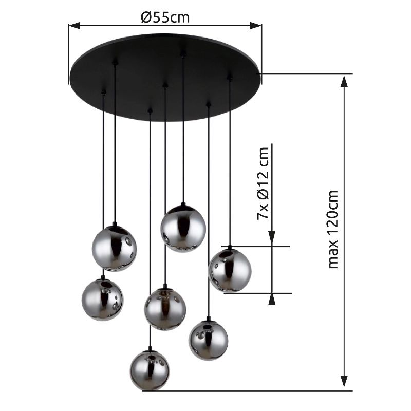 De RIHA hanglamp is een opvallend verlichtingsobject met een eigentijds, rond ontwerp en zeven hangers die zijn voorzien van elegante rookglazen bollen. Het lampenlichaam is gemaakt van zwart gelakt metaal met een matte afwerking, wat bijdraagt aan het moderne karakter. Met een diameter van ø 550 mm is deze hanglamp perfect voor middelgrote ruimtes en creëert het een sfeervolle ambiance door de unieke verlichting die de rookglazen bollen bieden.