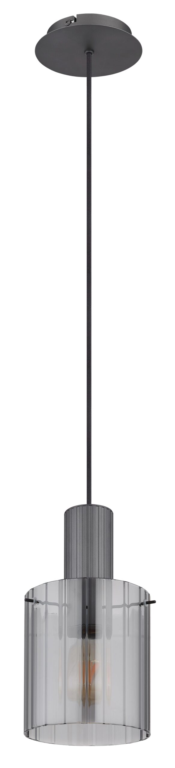 Deze stijlvolle en moderne hanglamp met een donkergrijs metalen pendel is de ideale verlichting voor jouw huis. De ronde, cilindervormige glazen kap met een rookkleurige uitstraling is versierd met elegante groeven, wat de lamp een verfijnde look geeft. Deze structuur zorgt voor een aangename en gelijkmatige lichtverspreiding. Met een diameter van 180 mm biedt de kap plaats aan een E27-lamp tot 40 watt, waardoor je voldoende keuzemogelijkheden hebt voor jouw favoriete verlichting.