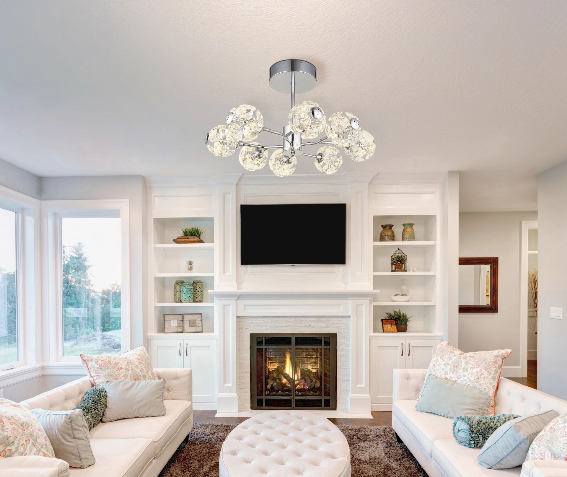 De VIRINA plafondlamp brengt stijl en luxe in uw interieur met zijn moderne design. Het chroom-plated metalen lichaam is uitgerust met acht elegante armen, die elk een heldere K9 kristallen bol dragen. Deze kristallen vangen het licht op een schitterende manier, waardoor ze een betoverende lichtreflectie creëren die de ruimte verrijkt met een warme en uitnodigende gloed. Met een diameter van 680 mm is deze lamp perfect voor grotere ruimtes zoals woonkamers en eetkamers.