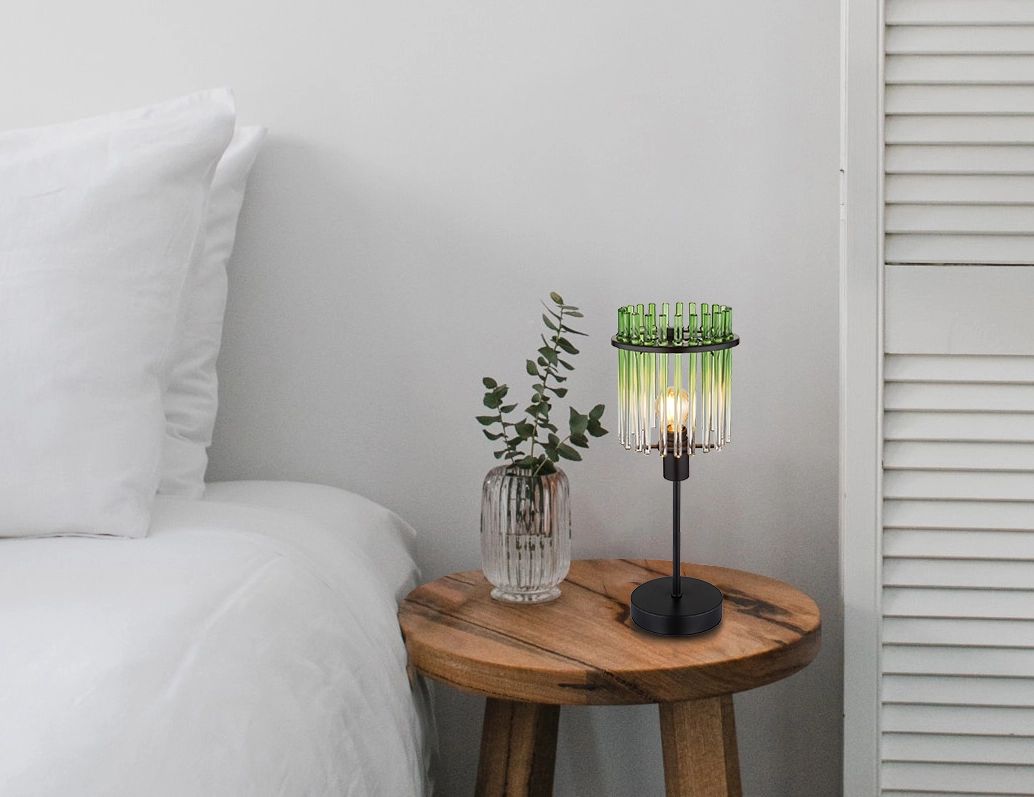 De GORLEY tafellamp is een perfecte combinatie van modern design en praktische functionaliteit. Met zijn ronde basis in matte zwarte metaalkleur en een unieke lampenkap van kunstzinnig gerangschikte groene glazen staven, komt deze lamp gegarandeerd in het oog. Het bijzondere ontwerp resulteert in een sfeervol lichtspel, waardoor elke ruimte een gezellige ambiance krijgt. Met een diameter van 150 mm is de GORLEY lamp ideaal voor kleinere tafels, nachtkastjes of desks in woonkamers, slaapkamers of kantoren.