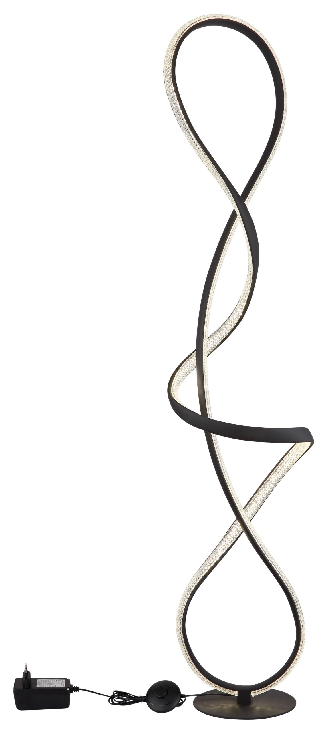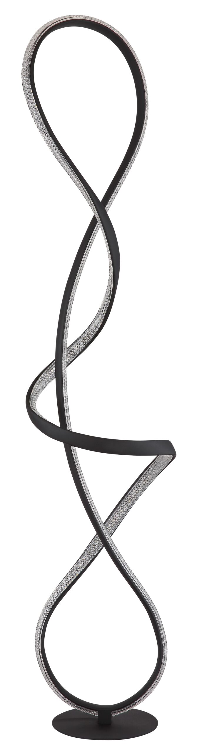 De SWIRL vloerlamp brengt een elegante charme in iedere ruimte door het verfijnde, gebogen ontwerp met stijlvolle bogen en knopen. Het frame is vervaardigd uit mat zwart metaal, terwijl de lampenkap is gemaakt van mat zwart aluminium, wat bijdraagt aan de moderne en chique uitstraling. Heldere kunststof en acryl kristallen vangen het licht en reflecteren dit op een indrukwekkende manier. Met een hoogte van 260 mm en een breedte van 200 mm is deze vloerlamp compact en biedt hij veelzijdigheid in gebruik.