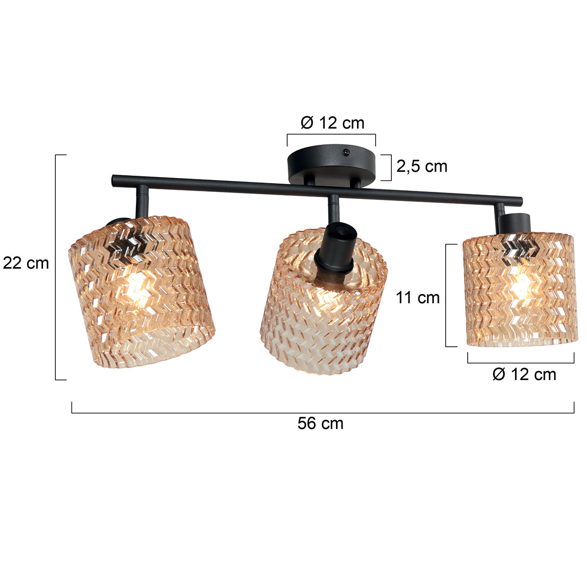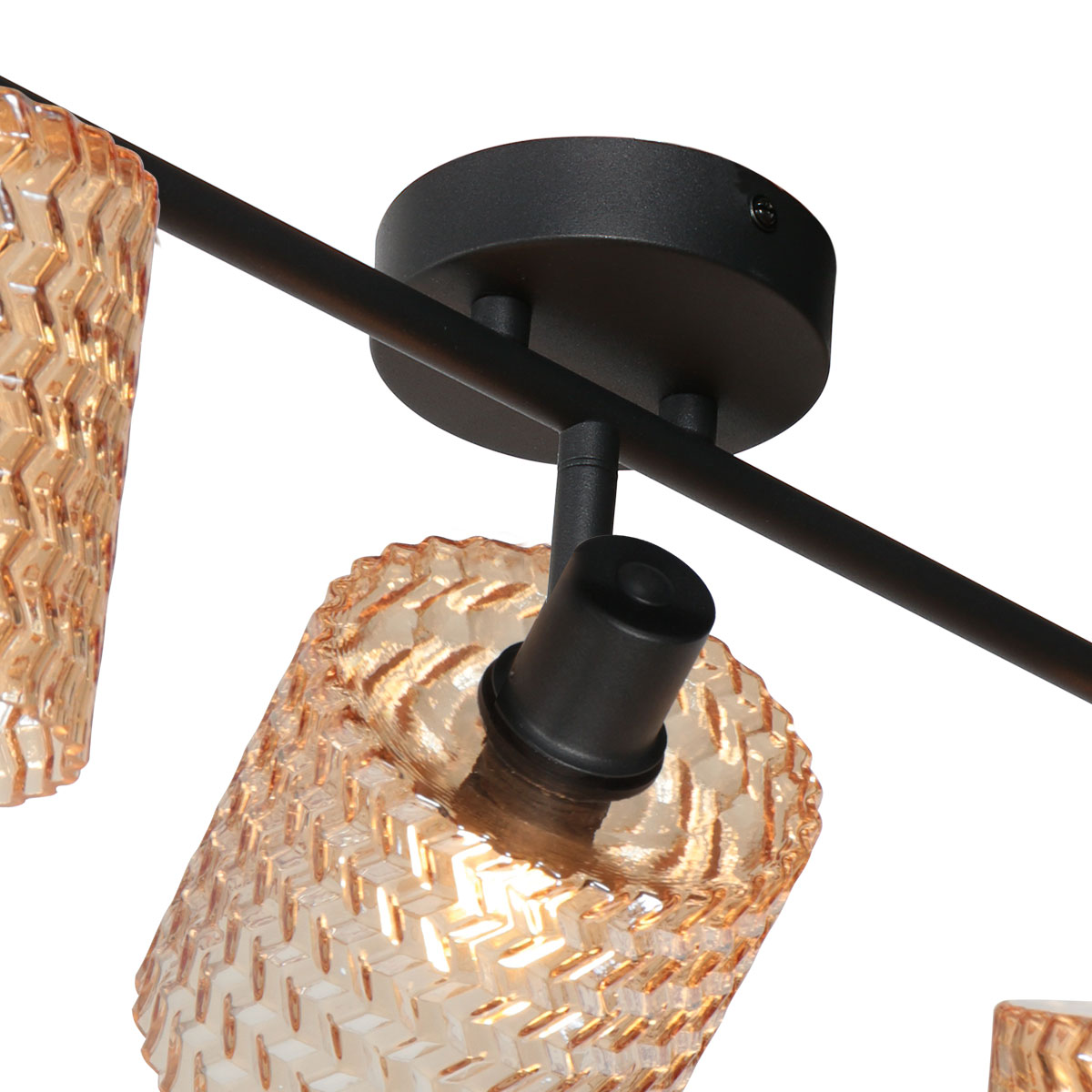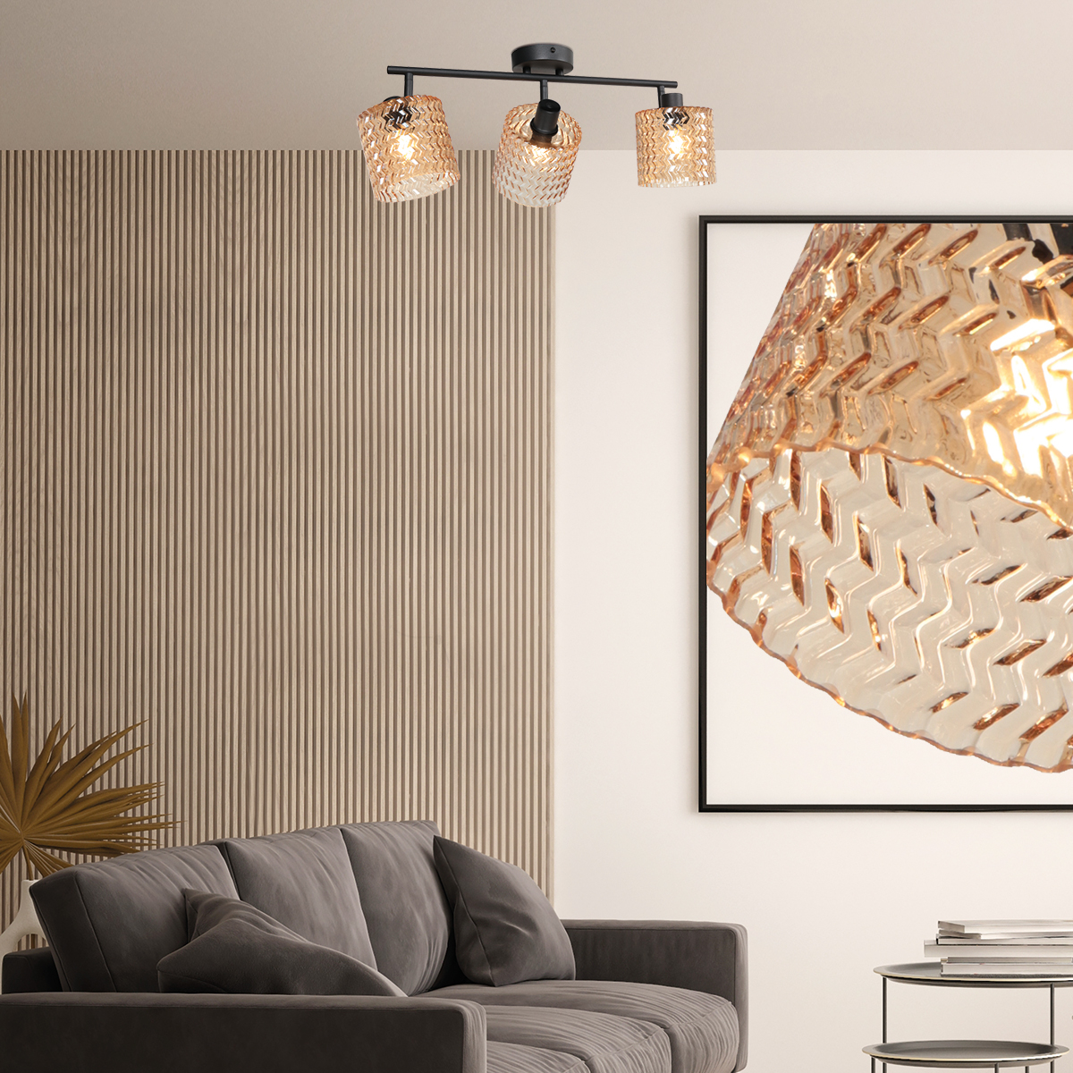 Deze plafondlamp is uitgevoerd met een strak zwart armatuur en drie lichtpunten, elk voorzien van een amberkleurige glazen kap met reliëfstructuur. Het patroon in het glas zorgt voor een warm en speels lichteffect, terwijl het zwarte metaal een rustig en modern contrast vormt. Door de combinatie van meerdere lichtpunten en decoratief glas is deze lamp geschikt als sfeerverlichting in bijvoorbeeld de woonkamer, hal of slaapkamer.