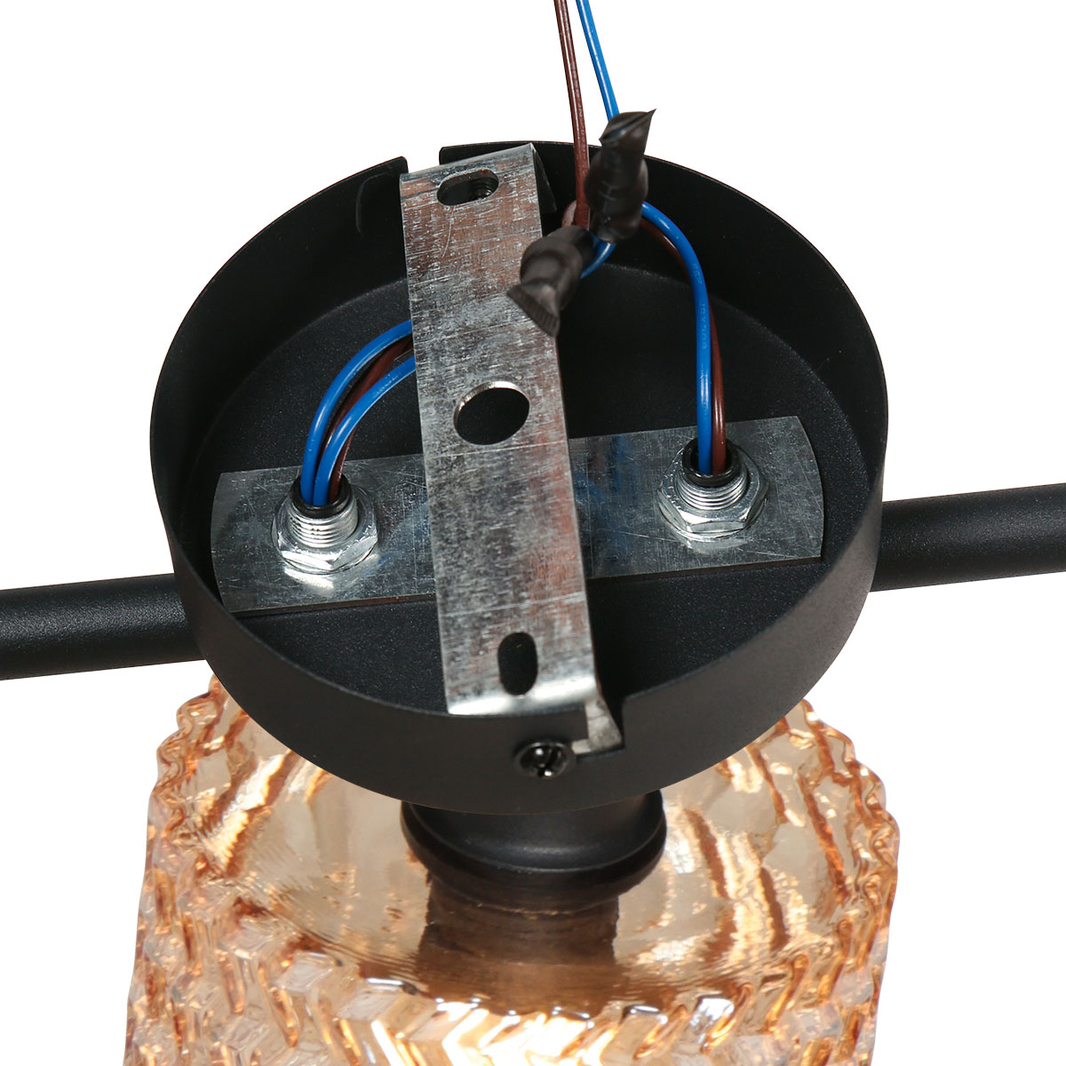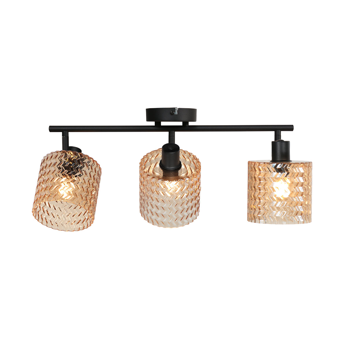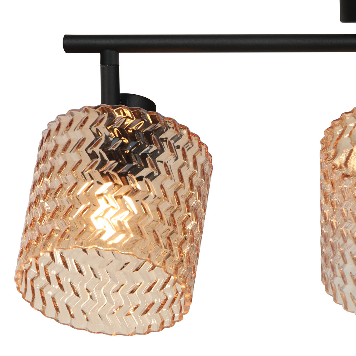 Deze plafondlamp is uitgevoerd met een strak zwart armatuur en drie lichtpunten, elk voorzien van een amberkleurige glazen kap met reliëfstructuur. Het patroon in het glas zorgt voor een warm en speels lichteffect, terwijl het zwarte metaal een rustig en modern contrast vormt. Door de combinatie van meerdere lichtpunten en decoratief glas is deze lamp geschikt als sfeerverlichting in bijvoorbeeld de woonkamer, hal of slaapkamer.