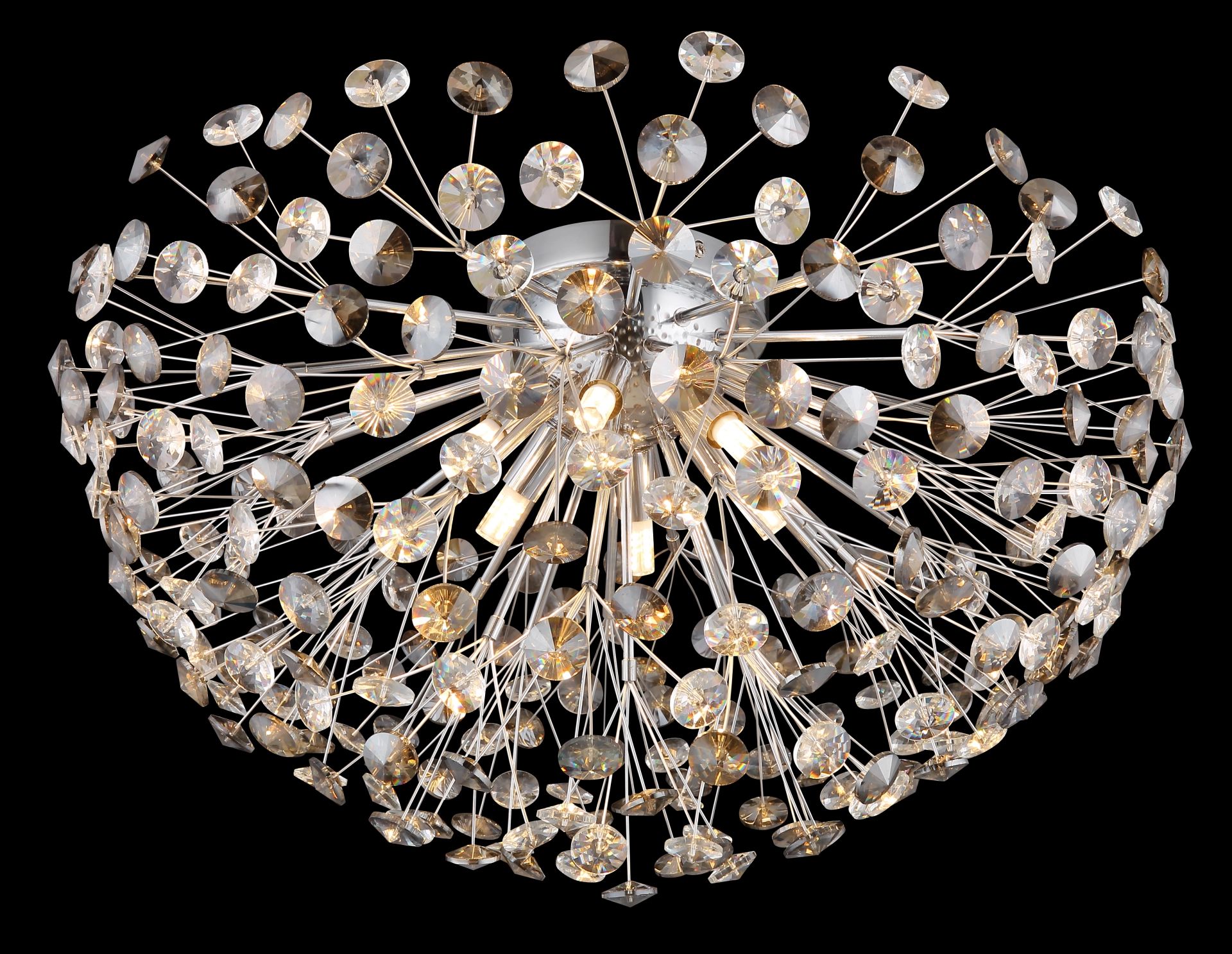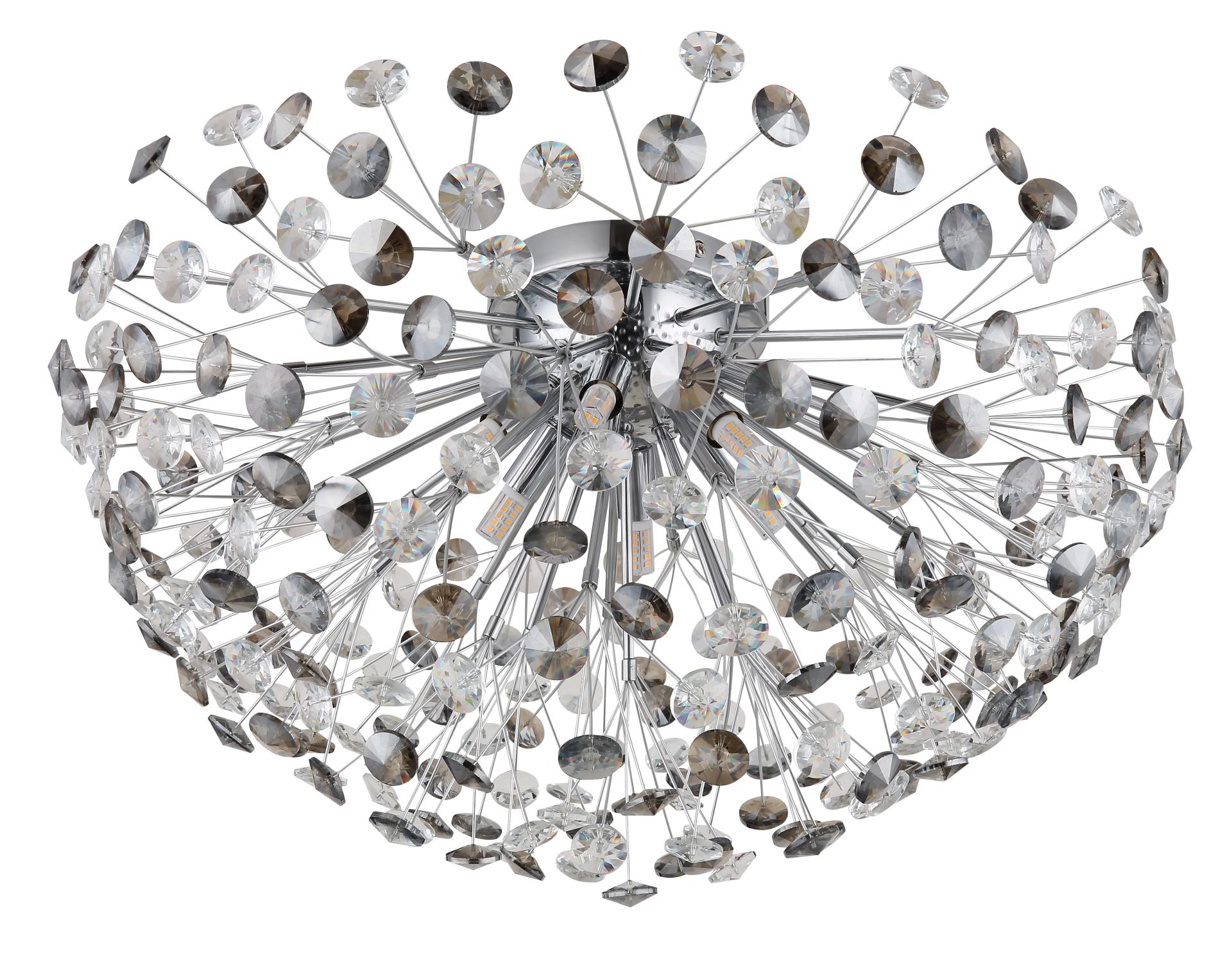 De plafonnière “KATRINA” verenigt klassiek design met moderne elegantie in een adembenemend geheel. De ronde, halfronde kap van gerookte en heldere K9-kristallen zorgt niet alleen voor een indrukwekkende lichtbreking, maar geeft de lamp ook een stijlvol uiterlijk. Het verchroomde metalen lichaam benadrukt de luxe afwerking en voegt een glanzende touch toe aan iedere ruimte. Met zes 6XG9 LED-lampen biedt de “KATRINA” warm wit licht met een kleurtemperatuur van 3000K en een lichtopbrengst van 350 lumen, wat zorgt voor een sfeervolle en gezellige ambiance.