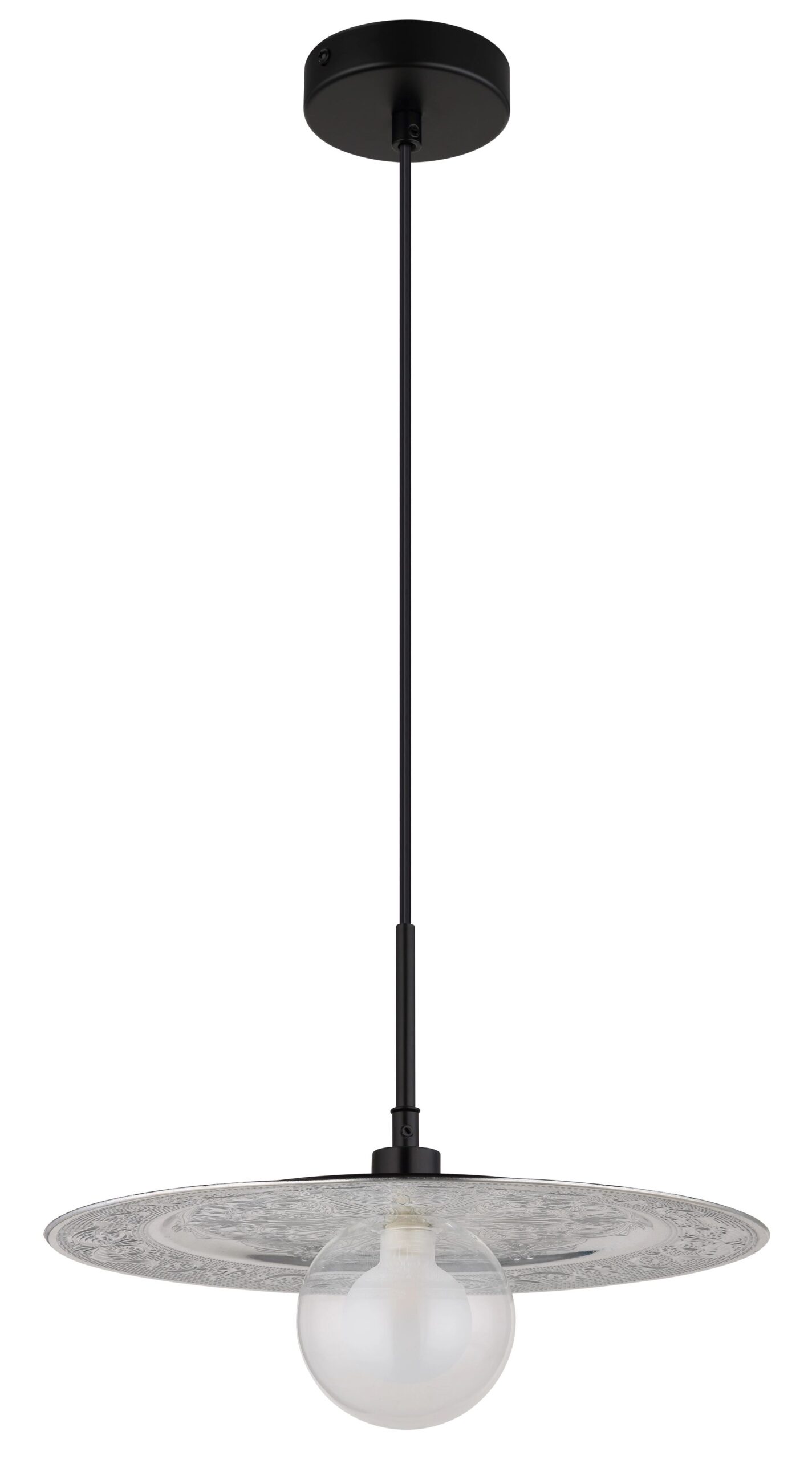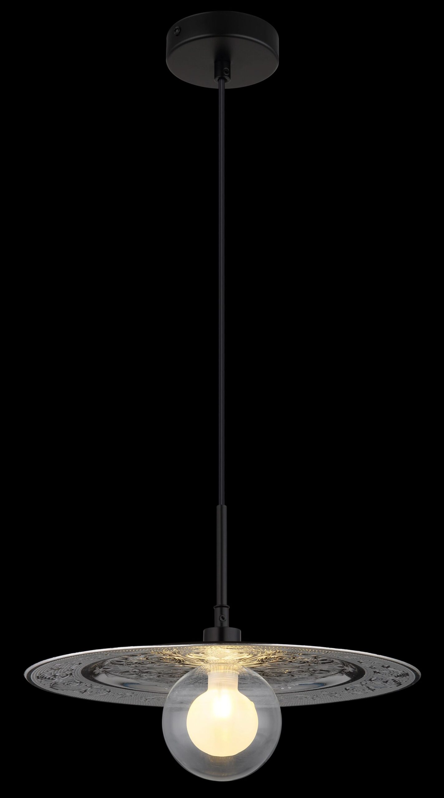 De RIGA pendellamp combineert traditioneel design met moderne elementen, wat zorgt voor een stijlvolle eyecatcher in uw interieur. Met zijn ronde, platte schijf en decoratieve accenten heeft deze lamp een elegante en tijdloze uitstraling. Het lichaam van de lamp, gemaakt van mat zwart metaal en plastic, geeft het geheel een hedendaagse flair. De zilveren plastic kap in combinatie met opaal en helder glas zorgt voor een fraaie lichtverdeling.