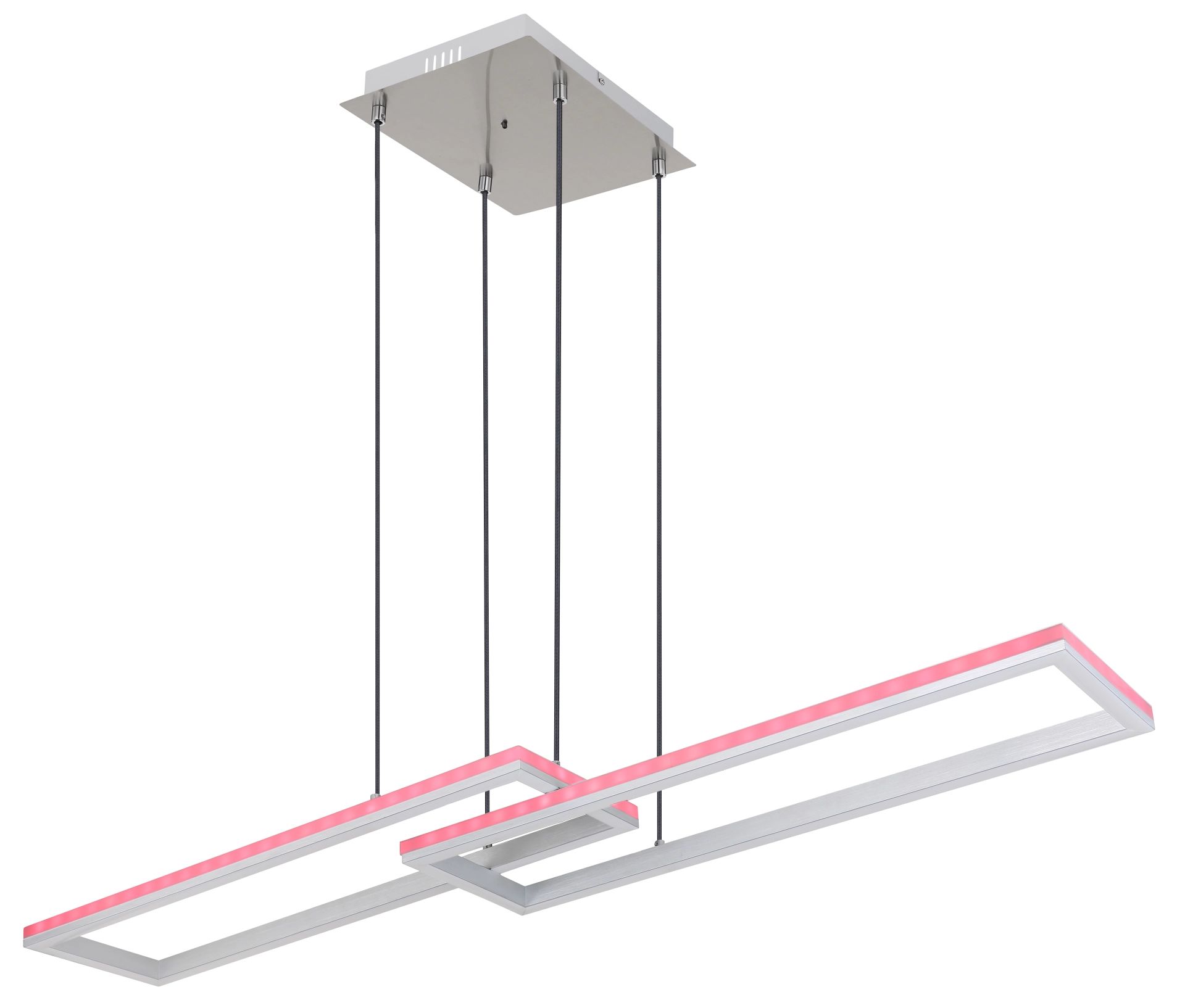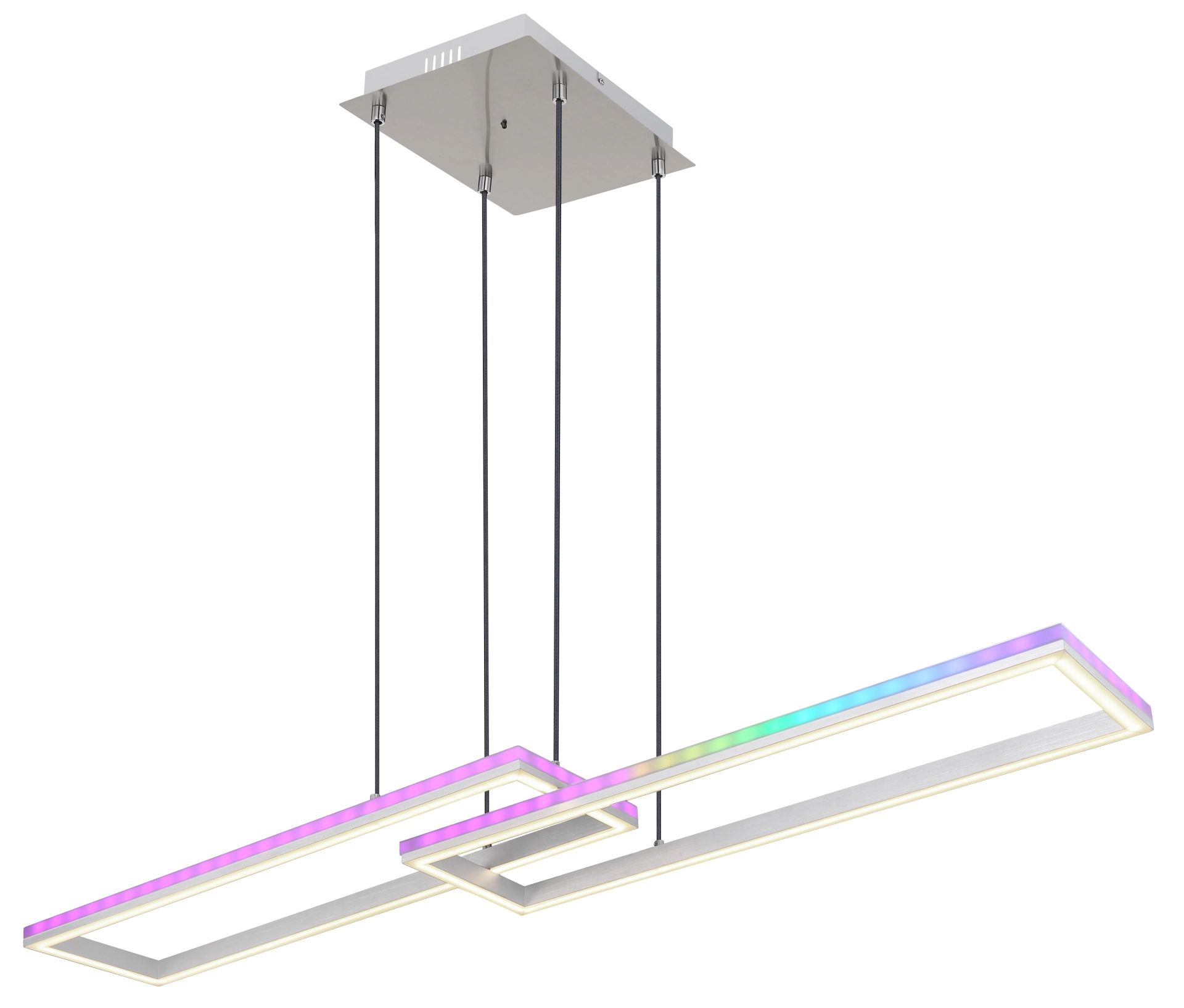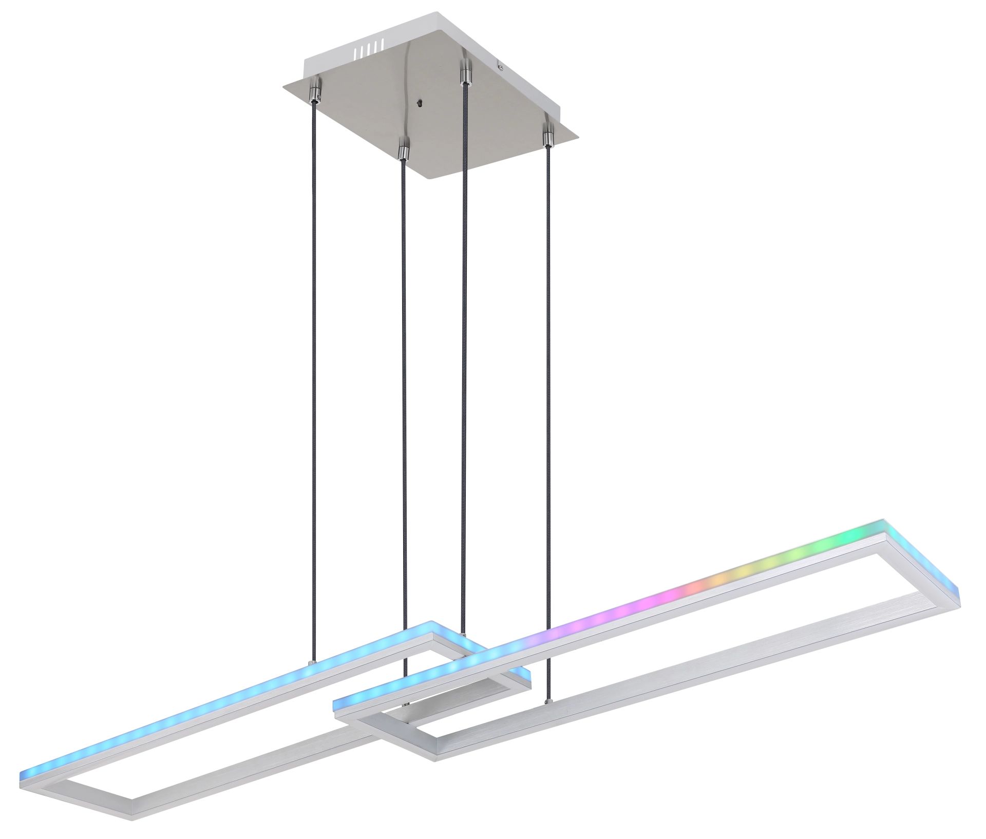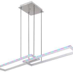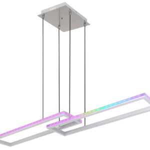 Ontdek de stijlvolle pendant lamp, vervaardigd uit zilvergrijs metaal en geborsteld aluminium. De opale kunststof kap zorgt voor een zachte en sfeervolle verlichting, terwijl de textielzwart kabel een chique uitstraling biedt. Deze dimbare lamp laat zich eenvoudig bedienen via de wandschakelaar, waarmee u verschillende helderheidsinstellingen kunt kiezen. Met de RGB-kleurenschakelaar kunt u moeiteloos de gewenste kleuren instellen, inclusief een indrukwekkend RGB regenboogeffect. Extra functies zoals de geheugenfunctie, nachtverlichting, een timer en een handige afstandsbediening met twee AAA-batterijen maken het geheel compleet.