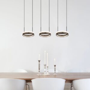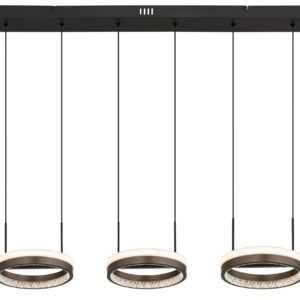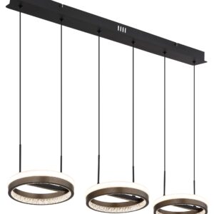 De DELLA pendant lamp in matte zwart is een uitstekende fusie van modern design en praktische functionaliteit. Deze elegante lamp is bevestigd aan een rechte rail en heeft drie hangers met ringen die de uitstraling verfijnen. Het lichaam is gemaakt van mat zwart metaal, wat prachtig samengaat met de lampenkap van donkergrijs aluminium, opaal kunststof en heldere kunststof kristallen.
