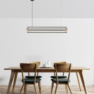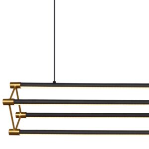 De kap, gemaakt van zwarte, matte aluminium stangen in combinatie met een metallic gouden afwerking, zorgt voor een elegant ontwerp dat de sfeer in uw ruimte versterkt. Het siliconen opaalfilter zorgt voor warme, uitnodigende verlichting. Met een lichtopbrengst van 2890 lumen en een temperatuur van 3000 K geeft deze lamp helder en sfeervol licht, perfect voor ruimtes waar een dramatisch effect gewenst is. De hanglamp van KAYSON is de ideale keuze voor liefhebbers van modern design en hoge kwaliteit, en voegt verfijning toe aan iedere omgeving.