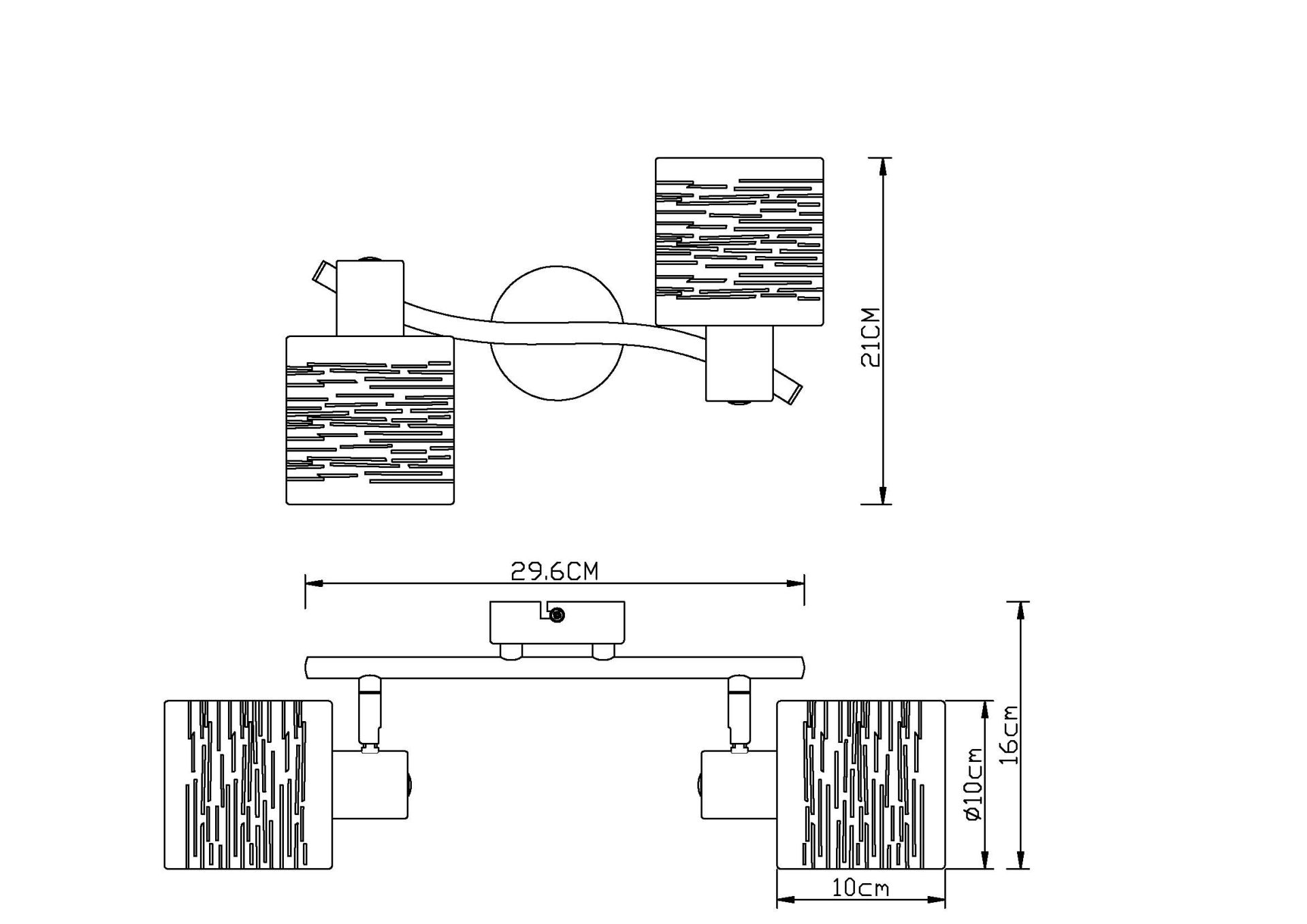 De plafondlamp TUNNO is een schitterend ontwerp dat de aandacht trekt en tegelijkertijd een sfeervolle verlichting biedt. Met een lengte van 29,6 cm is deze lamp uitgerust met twee stijlvolle spotlights, elk met decoratieve perforaties. De textiele lampenkappen hebben een elegante zwart-gouden binnenkant, wat bijdraagt aan de luxe uitstraling van de lamp. TUNNO is voorzien van twee E14-fittingen, waardoor je zelf de lichtbron kunt kiezen en de lichtintensiteit en kleur kunt aanpassen tot maximaal 15W. Voor optimale energiezuinigheid en een lange levensduur adviseren we het gebruik van LED-lampen.