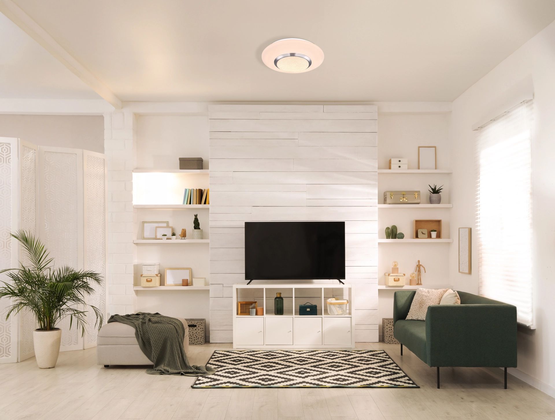 De CANDIDA plafondlamp is een prachtige ronde lamp met een diameter van 34 cm die sprankelende accenten toevoegt aan elk interieur. Het ontwerp omvat plastic kristallen die het licht van de elegante witte kap, gemaakt van opaal acrylglas, op een indrukwekkende manier weerkaatsen. Zelfs wanneer de lamp niet is ingeschakeld, straalt deze een luxe uitstraling uit. Deze veelzijdige plafondlamp is perfect voor verschillende ruimtes zoals de slaapkamer, woonkamer, kinderkamer of eetkamer.