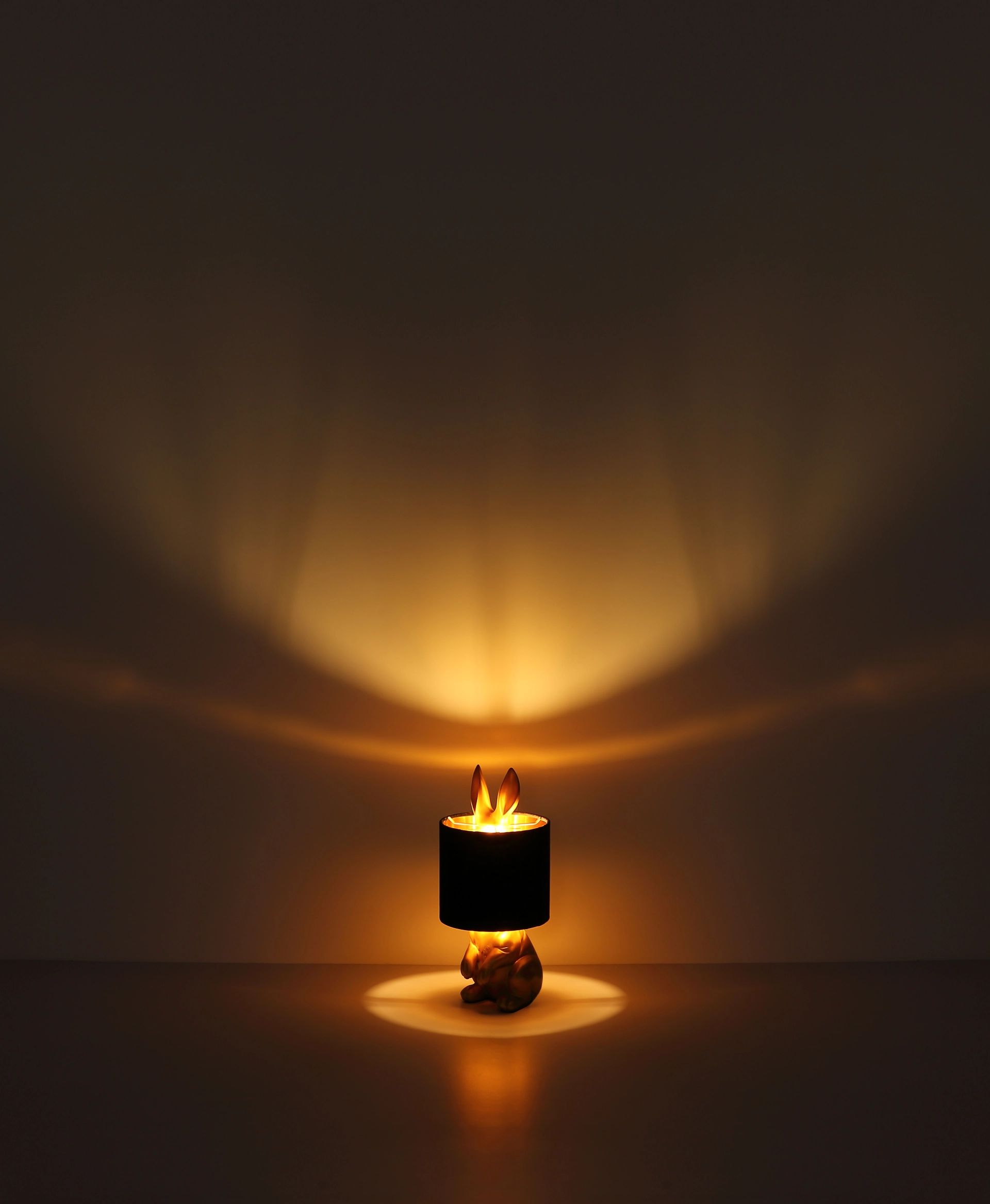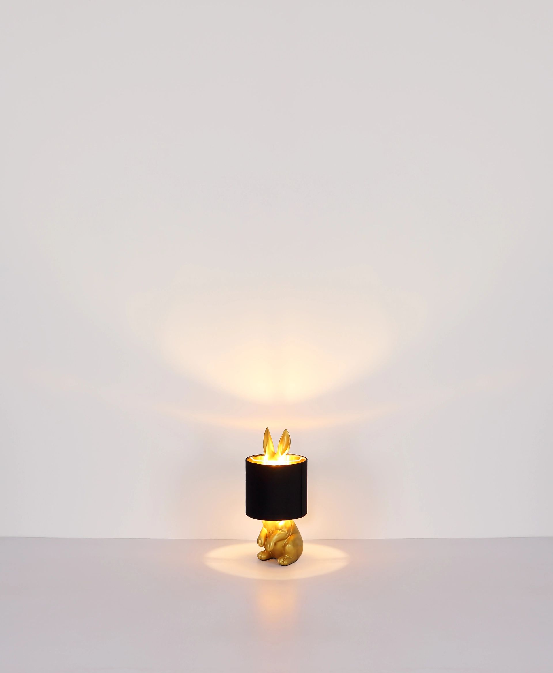 De RABBIT tafellamp is een unieke toevoeging aan elk interieur. Met zijn gouden konijn als basis en een stijlvolle zwarte fluwelen kap, brengt deze lamp zowel humor als elegantie in jouw ruimte. Het ontwerp is perfect voor liefhebbers van een speelse en verfijnde uitstraling. De lamp is geschikt voor E27 gloeilampen, die apart verkrijgbaar zijn.