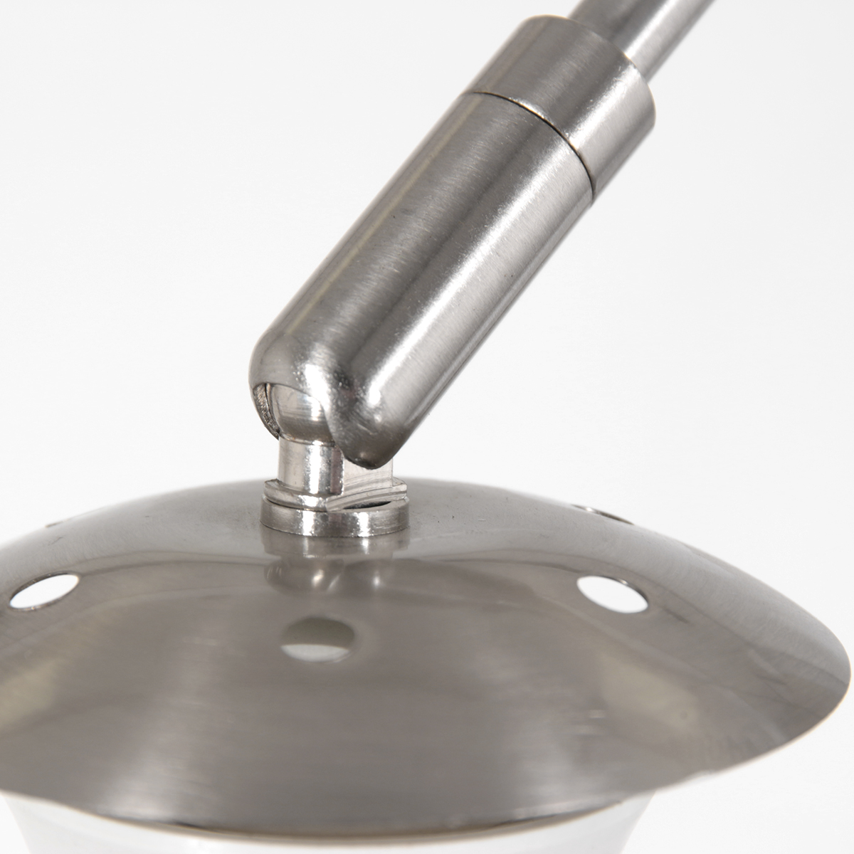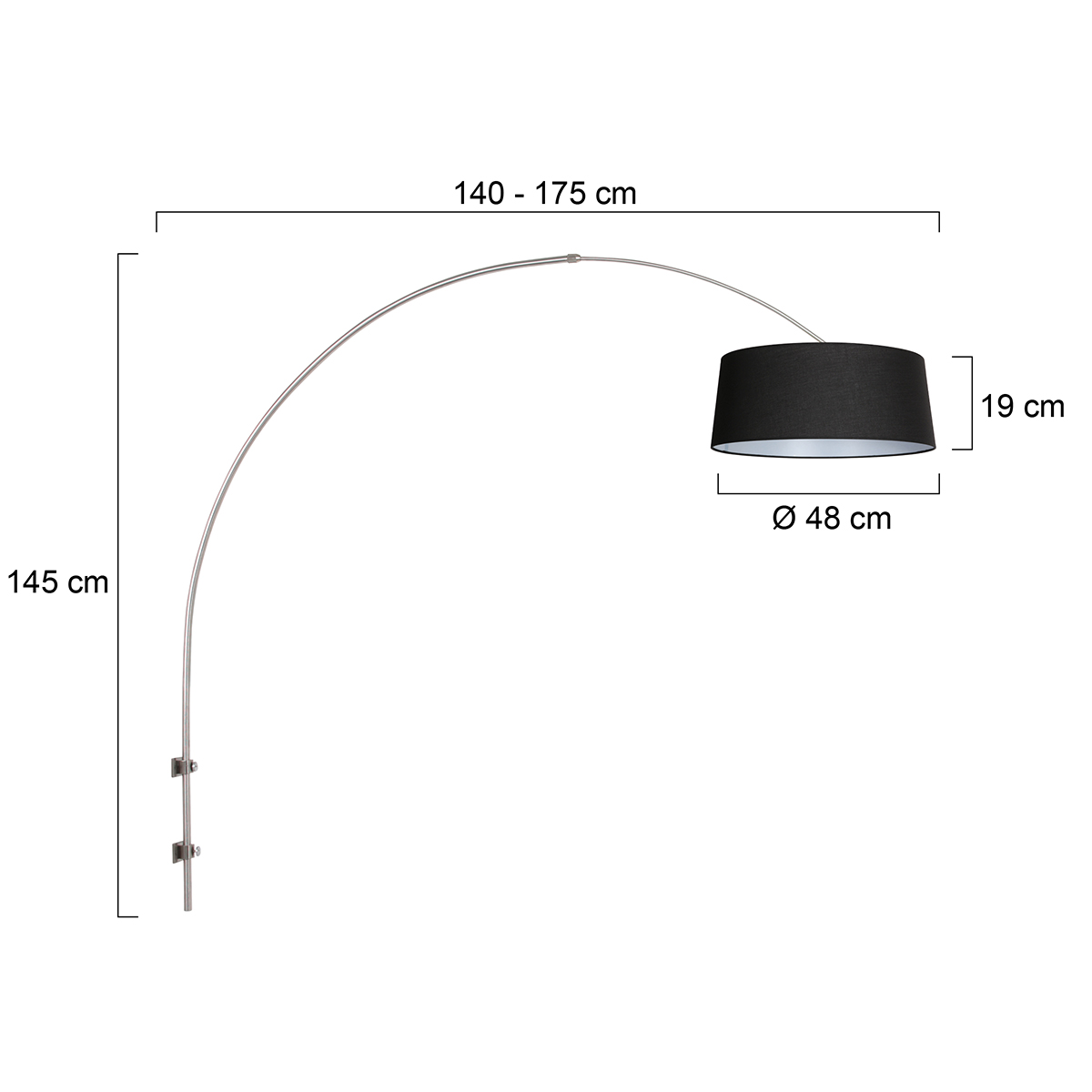 Deze staalkleurige boog wandlamp uit de Sparkled Light serie is een moderne blikvanger aan de muur. Het geborsteld roestvrijstalen armatuur heeft een hoogte van 145 centimeter en een in diepte verstelbare boog van 115 tot 160 centimeter. Dankzij de kantelbare E27 fitting kun je de kap altijd netjes recht hangen en verschillende soorten lichtbronnen tot 40 watt gebruiken. De lamp wordt compleet geleverd met een 200 centimeter lang snoer en aan-uit schakelaar, zodat je hem eenvoudig kunt aansluiten.