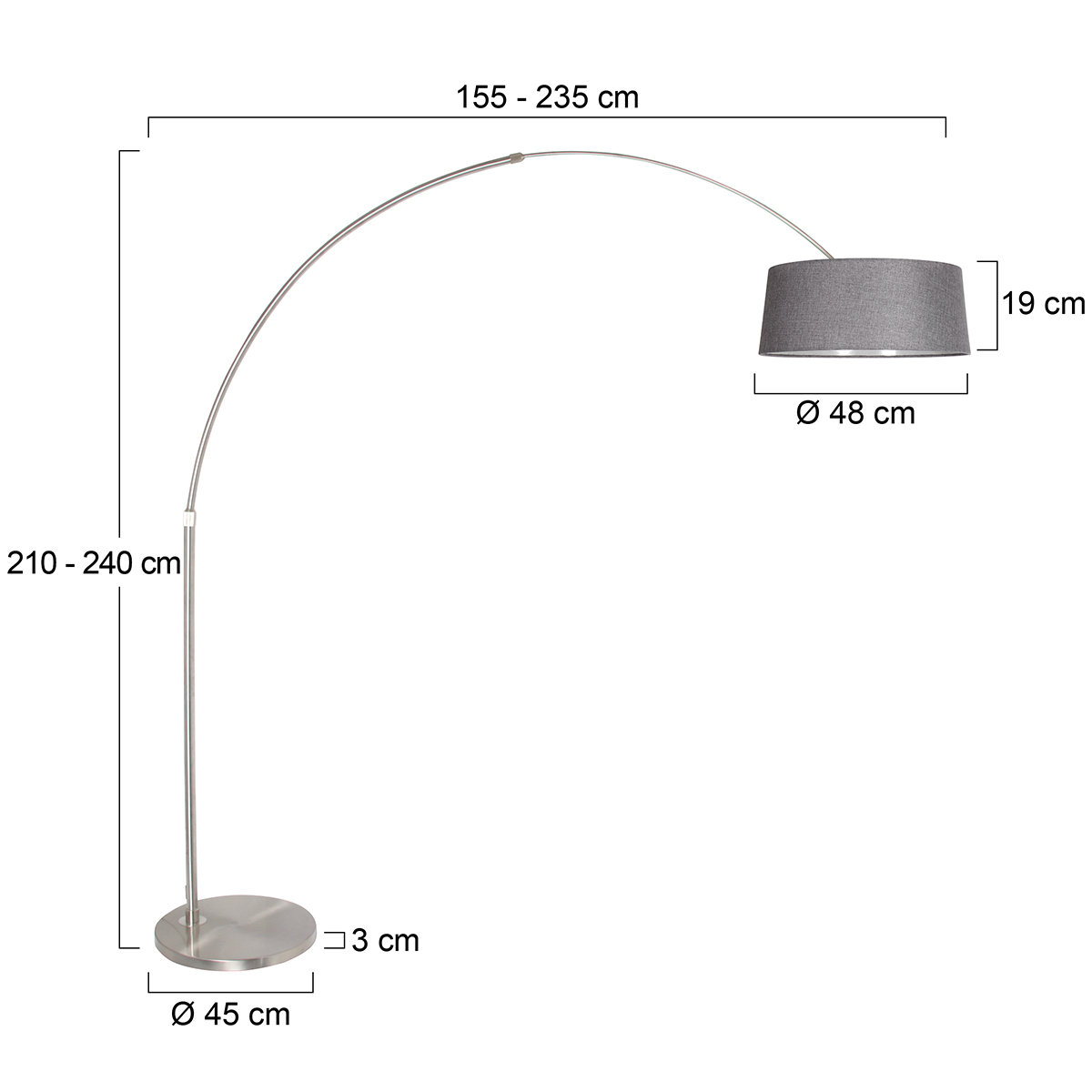 Deze set combineert de staalkleurige booglamp uit de Sparkled Light serie met de crèmekleurige linnen lampenkap van 48 centimeter. Het armatuur is uitgevoerd in geborsteld staal, heeft een stevige voetplaat van 45 centimeter en is verstelbaar van 210 tot 240 centimeter. De kantelbare E27 fitting zorgt ervoor dat de kap altijd mooi recht hangt en via het snoer van 250 centimeter met voetschakelaar bedien je de lamp eenvoudig.