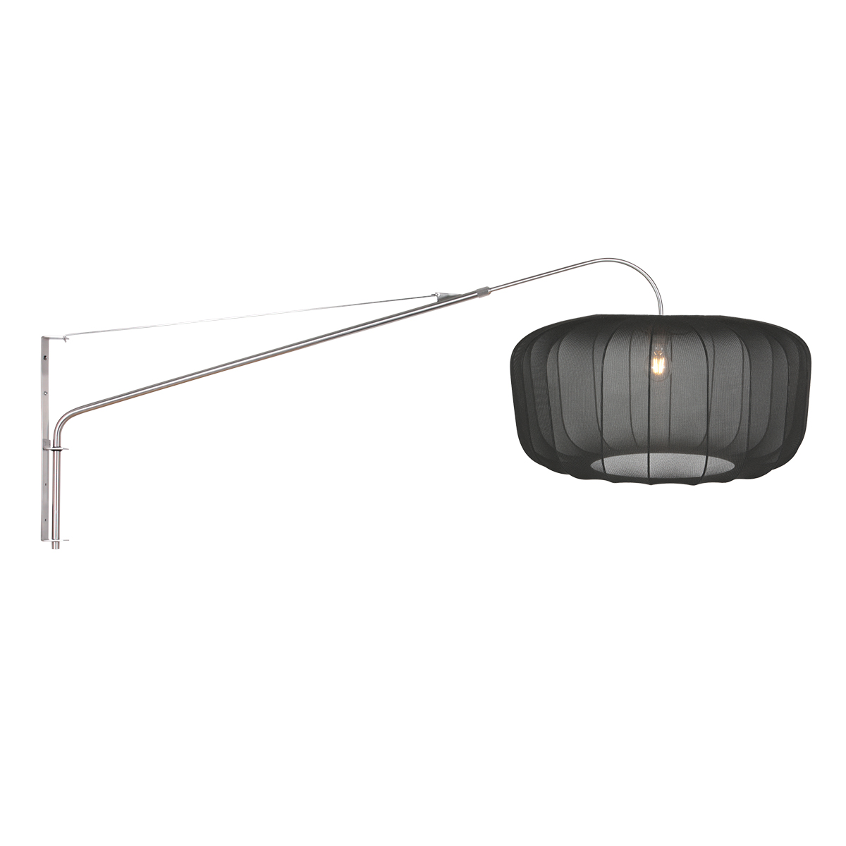 Deze staalkleurige wandlamp biedt een moderne en functionele lichtoplossing dankzij de grote ronde zwarte lampenkap van 60 centimeter diameter en 30 centimeter hoogte. Het armatuur is uitgevoerd in geborsteld staal en beschikt over een uitschuifbare en zwenkbare arm van 90 tot 120 centimeter. De kantelbare E27 fitting zorgt ervoor dat de kap altijd mooi recht hangt en het 180 centimeter lange zwart-witte snoer is voorzien van een handige schakelaar.