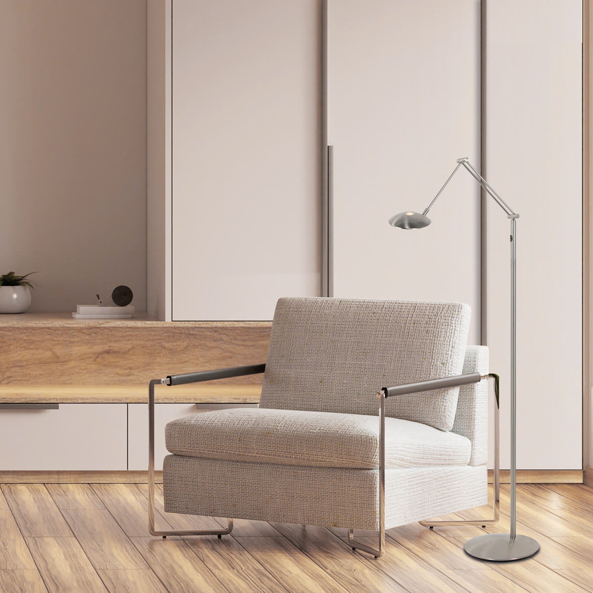 Deze elegante Daphne 2 leesvloerlamp in geborsteld staal is ontworpen voor wie comfort en modern design wil combineren. De rustige, eigentijdse uitstraling past perfect in moderne, minimalistische en tijdloze interieurs. Dankzij het slanke silhouet en de op drie punten verstelbare arm richt je het licht zeer nauwkeurig, ideaal naast een fauteuil, bank of werkplek.