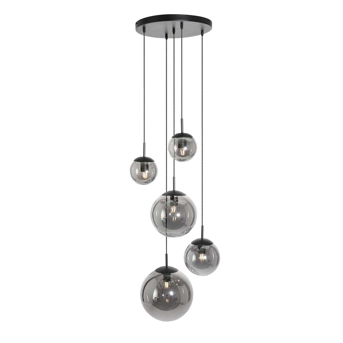 De Bollique plafondlamp combineert vijf rookglazen lichtbollen in verschillende formaten tot een stijlvol geheel. De lichtspiegelende afwerking zorgt voor een subtiel spel van reflectie en lichtverspreiding. Met een maximale lengte van 350 cm is de lamp ideaal voor zowel standaard plafonds als hoge vides. De plafondplaat heeft een diameter van 40,5 cm, wat zorgt voor een gebalanceerde ophanging. Elke lichtbol is voorzien van een E27-fitting en geschikt voor lichtbronnen tot 40 Watt. De zwarte strijkijzersnoeren versterken het eigentijdse karakter van de lamp.