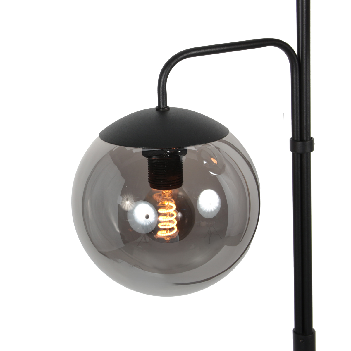 Deze 3-lichts vloerlamp uit de Bollique serie combineert een krachtig silhouet met sfeervolle verlichting. Het zwarte metalen frame vormt een stijlvol contrast met de drie grijs rookgekleurde glazen bollen, die het licht subtiel filteren en zorgen voor een rustige, aangename gloed. De speelse verdeling van de lichtpunten geeft de lamp karakter, terwijl de ronde vormen zorgen voor een tijdloze uitstraling die past in moderne en industriële interieurs.