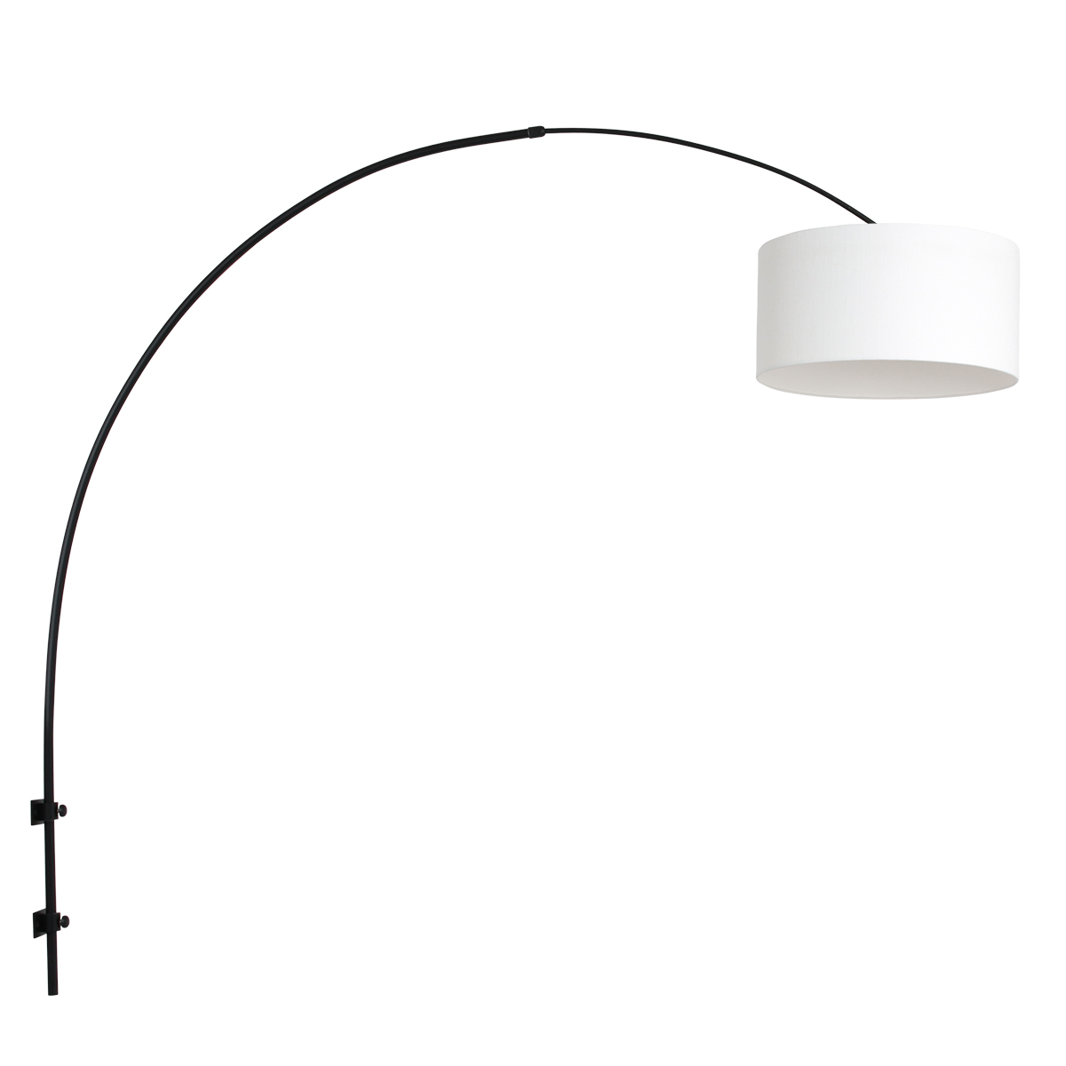 Een elegante combinatie van klassiek en modern. De witte linnen kap zorgt voor een frisse, tijdloze look, terwijl het gebogen zwarte frame zorgt voor een luchtige en verfijnde uitstraling. De verstelbare boog maakt deze wandlamp niet alleen een blikvanger, maar ook een functionele lichtbron.