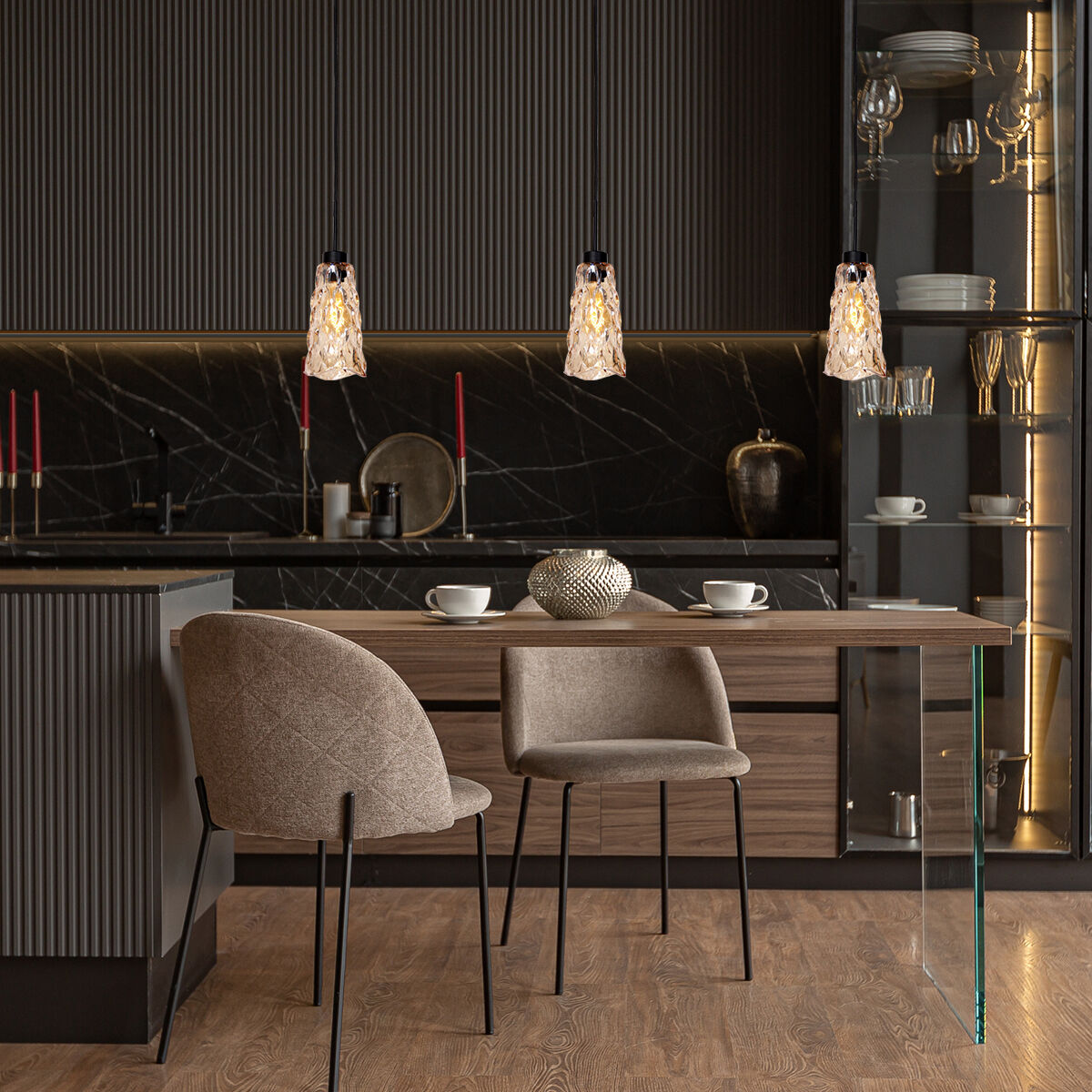 De glazen hanglamp Vidrio van Steinhauer straalt een retro charme uit met een eigentijdse twist. De bekervormige kap van gegolfd amberkleurig glas verspreidt een sfeervol en warm licht. Voorzien van een E27 fitting, waardoor de lichtbron naar wens kan worden gekozen. Het zwarte armatuur biedt een stijlvol contrast en is in hoogte verstelbaar van 30 tot 160 cm. Met een diameter van 13 cm is deze lamp ideaal voor boven een bar of als sfeervolle aanvulling in de eetkamer, hal, slaapkamer of woonkamer. Geleverd met 2 jaar fabrieksgarantie.