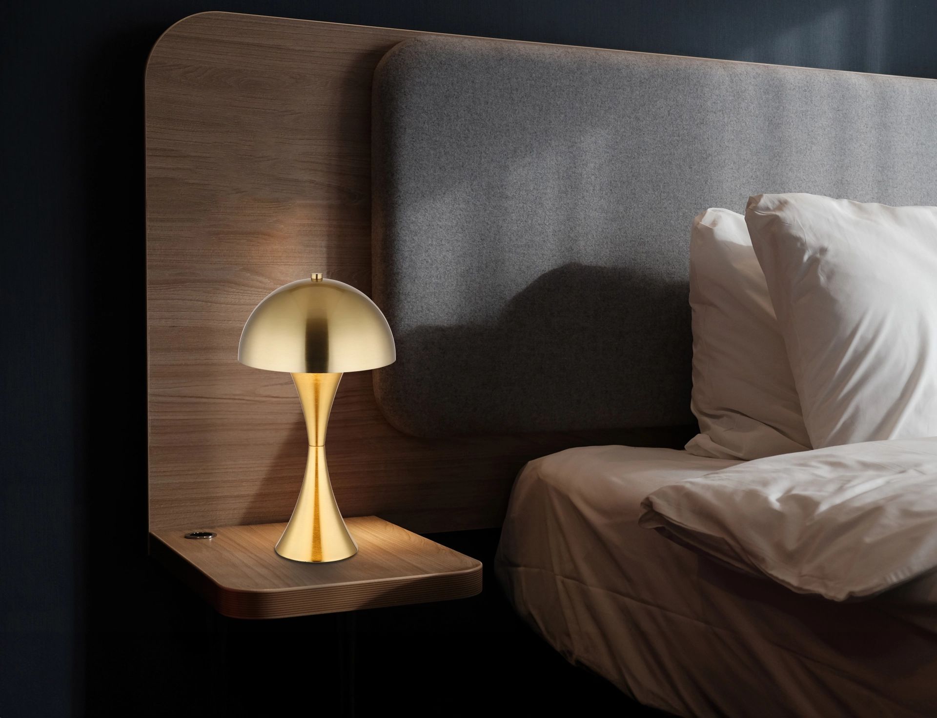 De DIMA tafellamp is vervaardigd uit mat messingkleurig metaal en vormt een stijlvolle aanvulling voor elke tafel. De aantrekkelijke metalen constructie harmonieert perfect met de lampenkap, wat resulteert in een samenhangende uitstraling die elegantie toevoegt aan uw interieur. Dankzij de praktische rocker schakelaar op de kabel is de lamp eenvoudig te bedienen, wat het gebruiksgemak verhoogt.